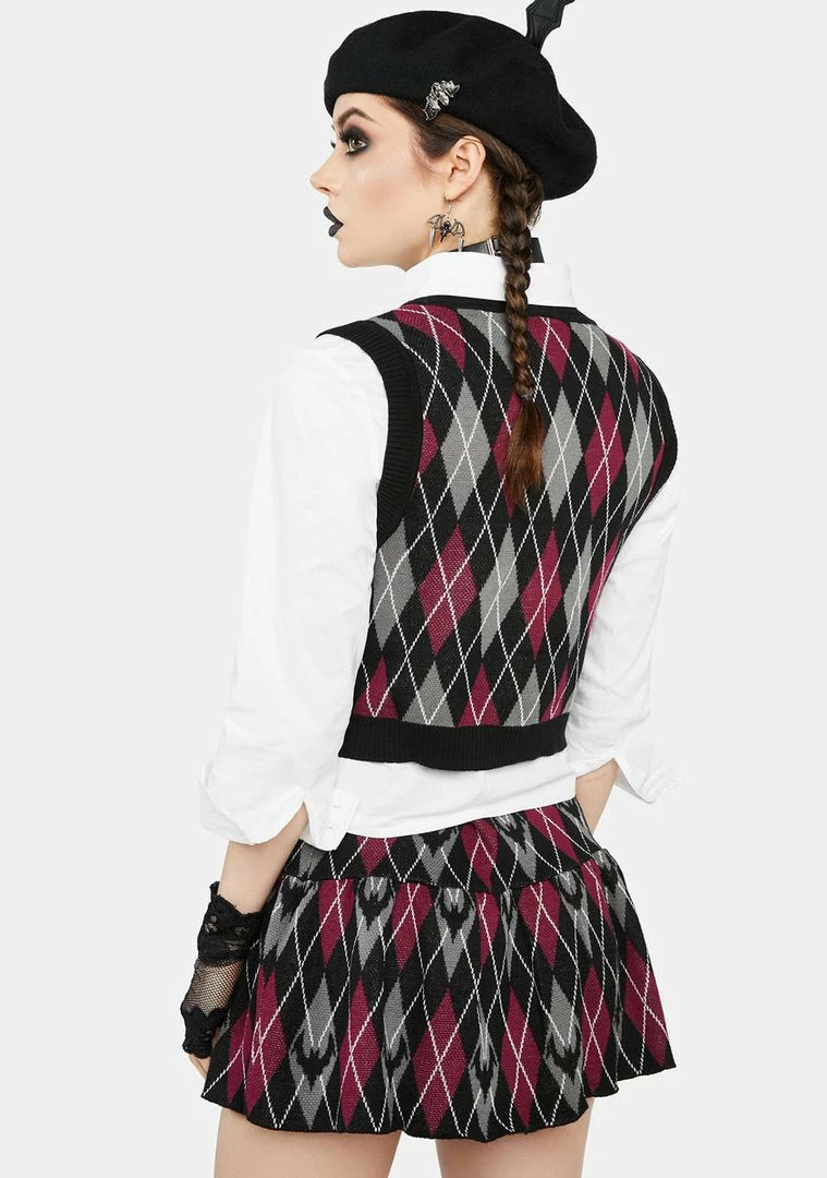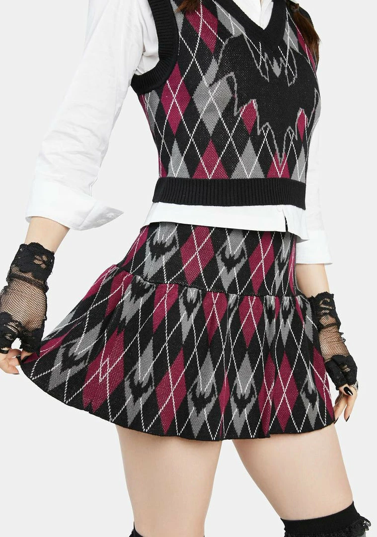 cuz you’re one fang-tastic student! This high-waisted mini skirt has bats and an argyle pattern printed all over, a cozy and stretchy knit construction, and a tiered A-line silhouette.