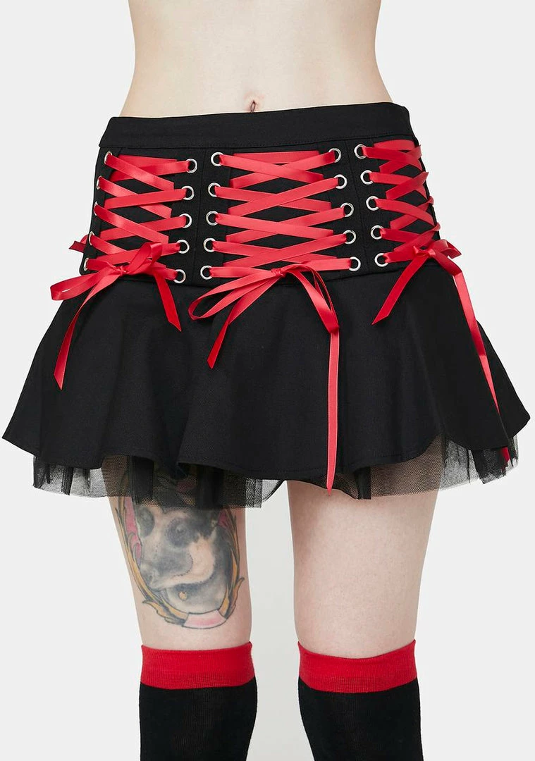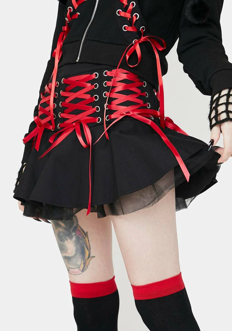 cuz youΓ’ΒΒre feeling immortal. This pleated mini skirt has sheer tulle underlayers, a high waist fit, and contrast red ribbon lace-ups all over.
