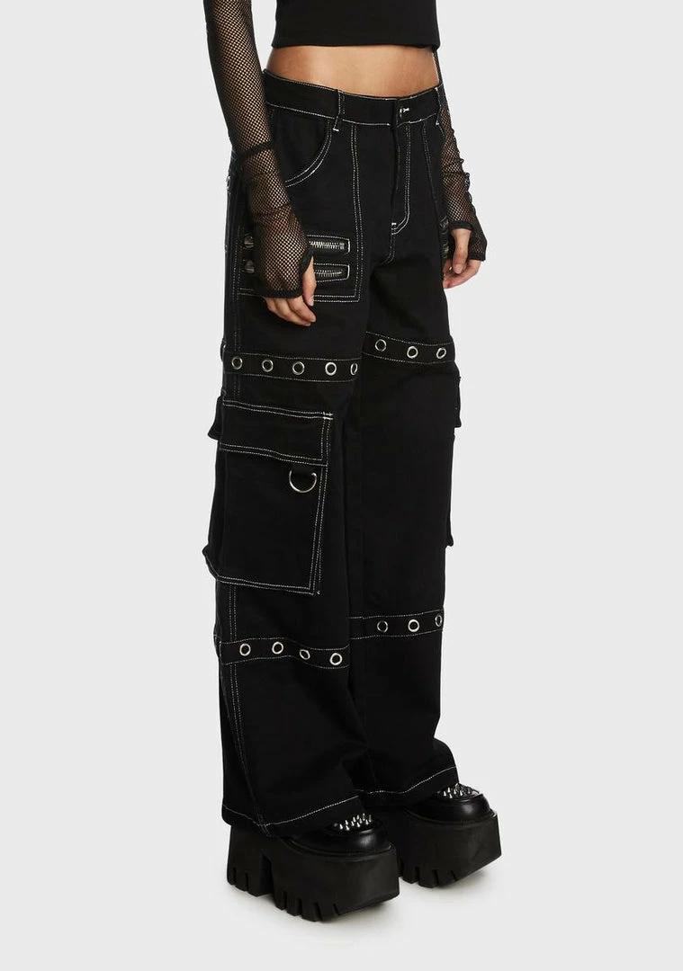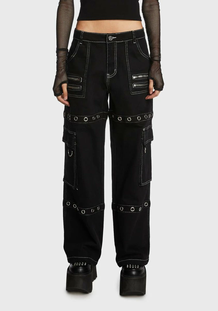 cuz it takes courage to stand alone. These low-rise pants have a non-stretch twill construction, side and back pockets, zippered and cargo-style leg pockets, grommet and D-ring hardware, contrast-colored stitching, and a front zip-fly closure.