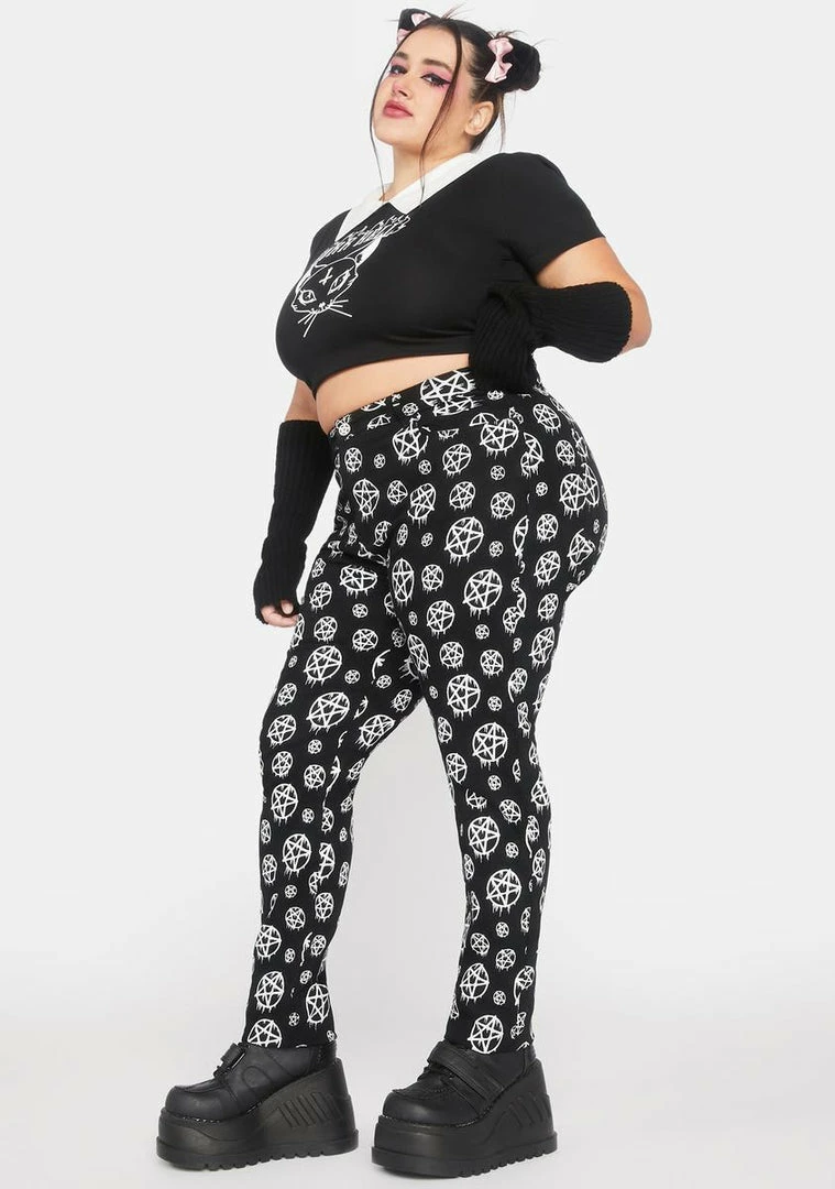embrace the darkness. These jeans come with a pentagram button detail and zip closure, front and back pockets, a pentagram print all over, and a high waist.