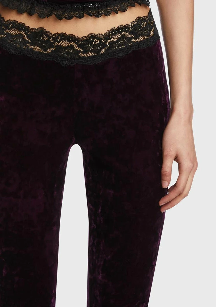 cuz you have magic from within. These leggings have a stretchy crushed velvet construction, an elastic waistband, a flared leg silhouette, a low waist fit, and a lace trim.