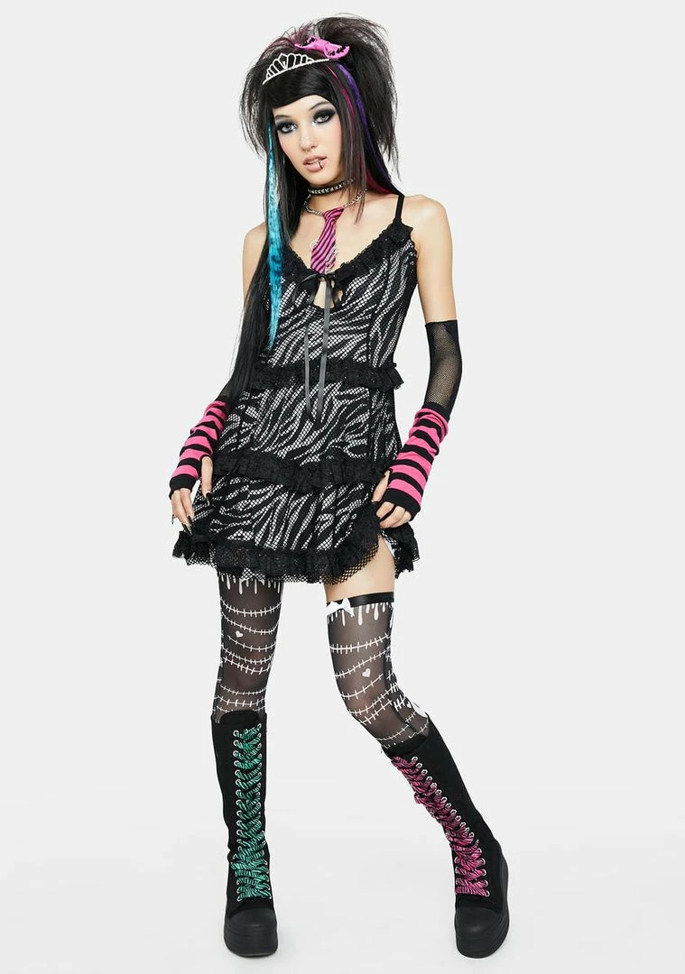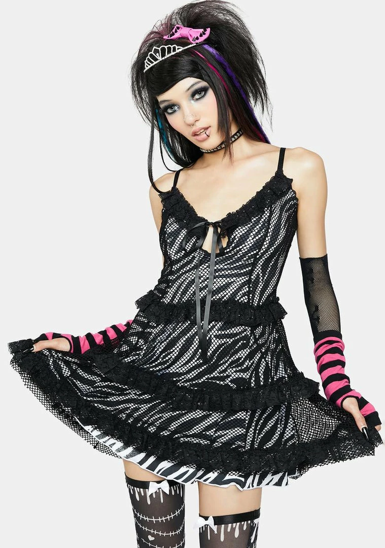 cuz you’re ready to dance. This mini dress has an all over zebra print, a fishnet overlay, a lace trim, a keyhole neckline, adjustable shoulder straps, and a satin bow on the front.