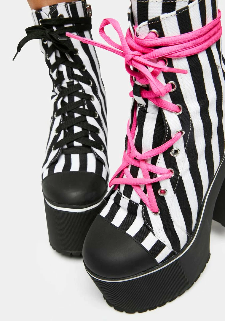 cuz you’re in my top 8! These platform boots have a vegan leather and canvas twill construction, a striped pattern all over, treaded outsoles, chunky block heels, different colored laces with a pentagram star design, and side zip closures.