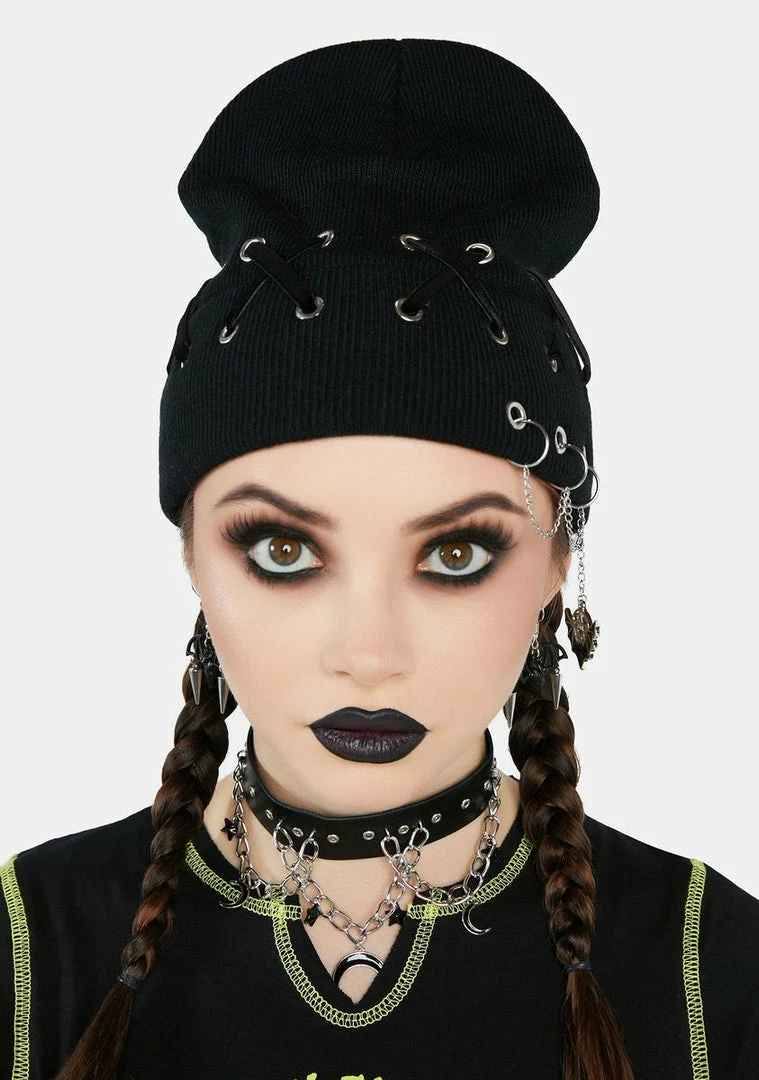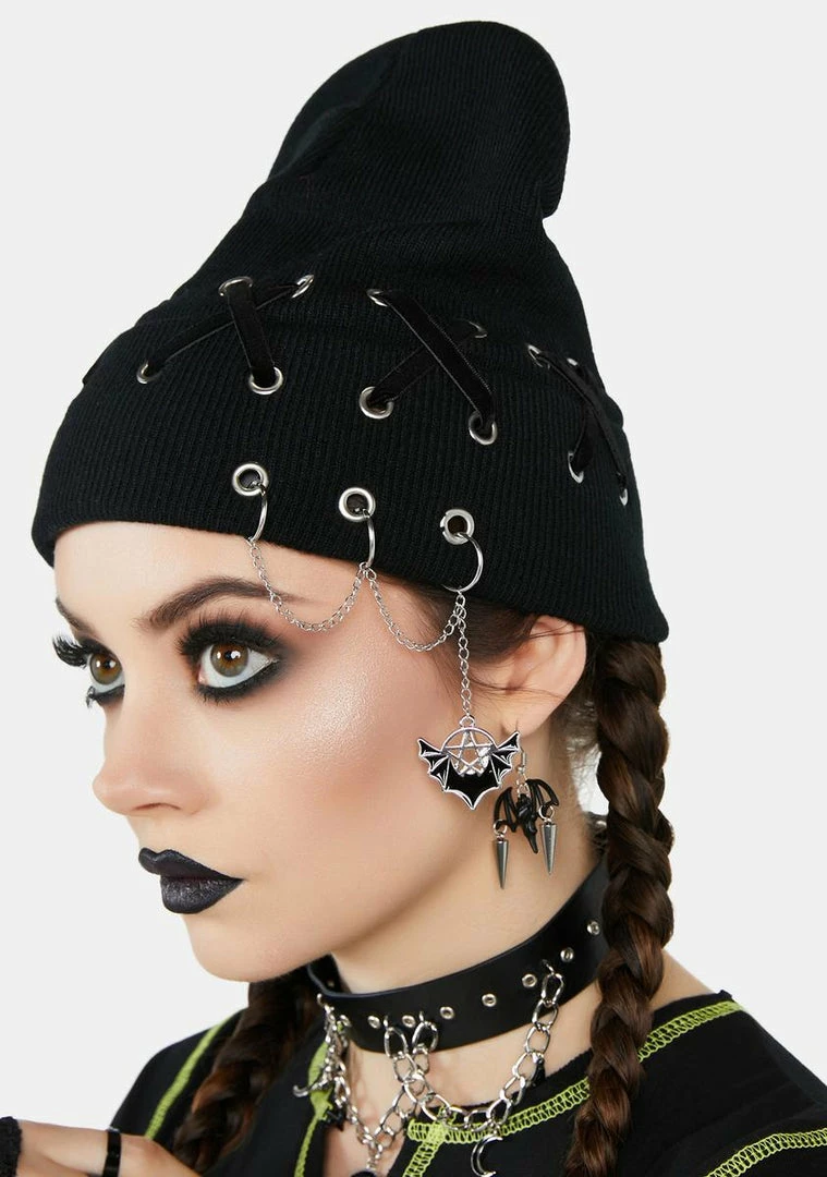 cuz there’s no goin’ back now. This beanie has a soft and stretchy ribbed knit construction, crisscross velvet ribbons, and side piercings with chains and a bat charm.