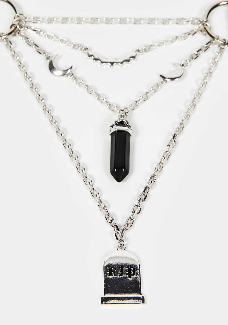 cuz being mortal is boring. This necklace has a vegan leather construction, an adjustable buckle closure, and D-ring hardware with triple layered chains on the front that feature crescent moon, crystal, and รขยยr.i.pรขยย tombstone charms.