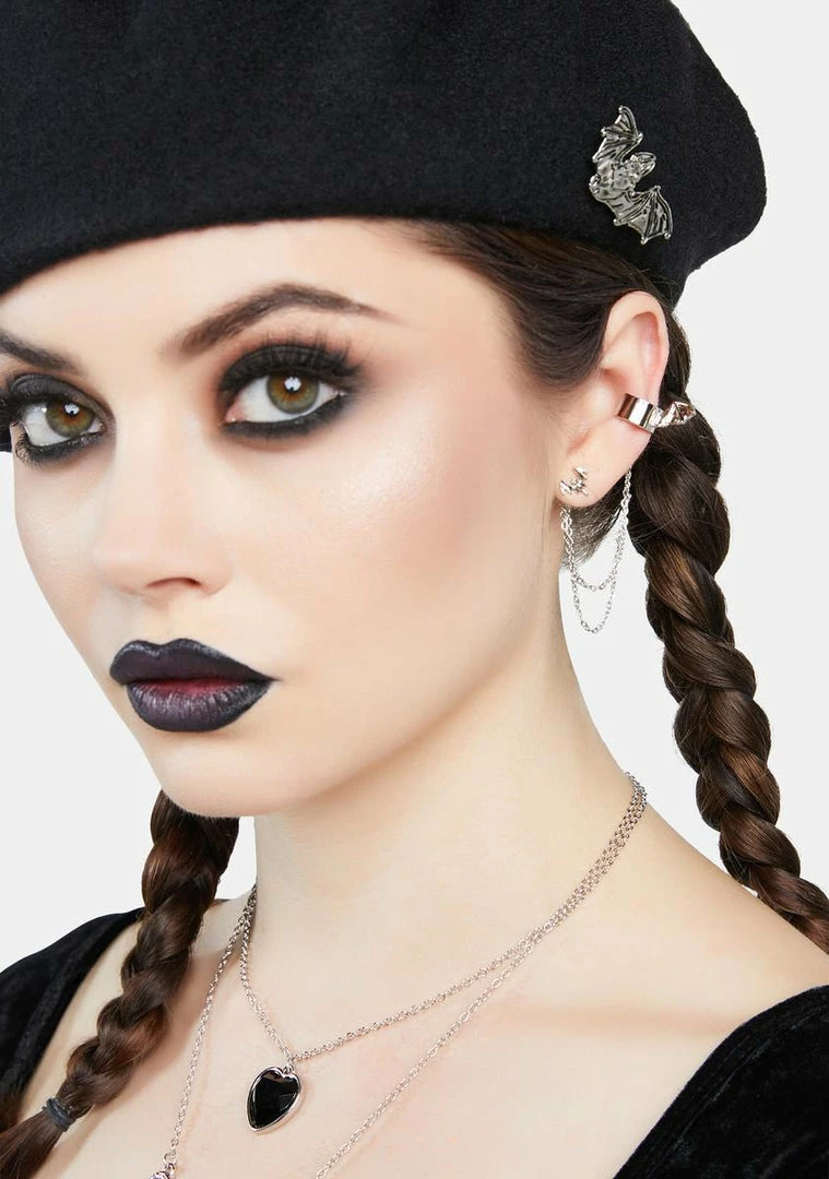cuz you could fly all night. These earrings come with a bat stud detail, a bat wing ear cuff, and chain details.