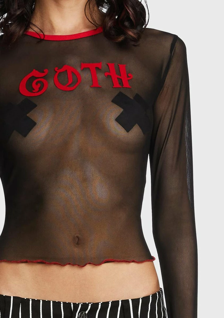 cuz you find beauty in the grotesque and macabre. This crop top has a stretchy sheer mesh construction, “GOTH” printed at front, a contrast-colored crew neckline, long sleeves with thumbhole cuffs, and lettuce edge trim.