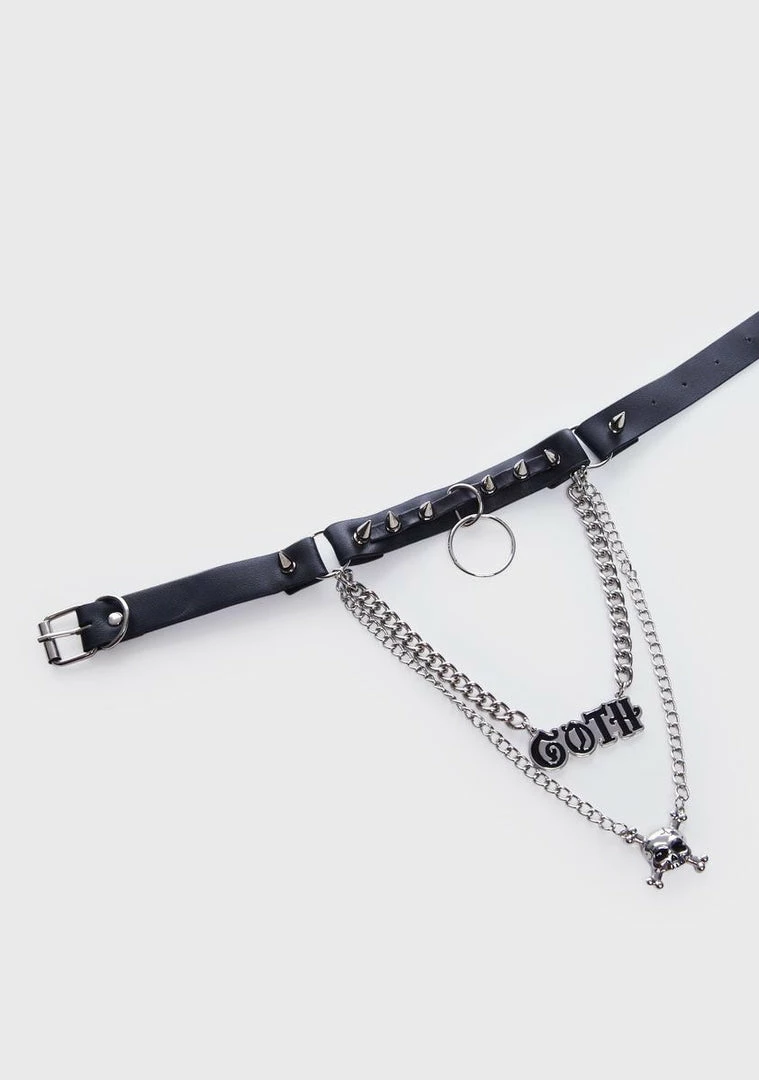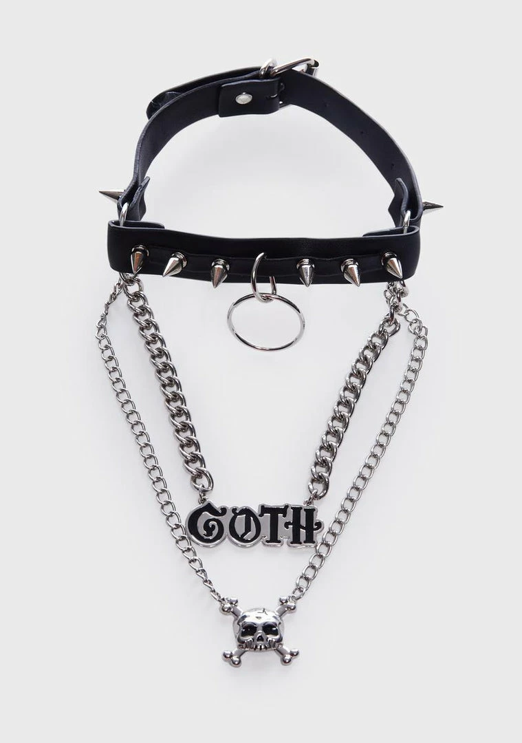 cuz goth forever. This layered choker has a vegan leather construction, chain link detailing, spikes, O-ring hardware, skull and “Goth” word charms in the center, and an adjustable buckle closure.