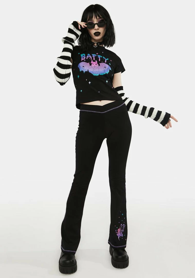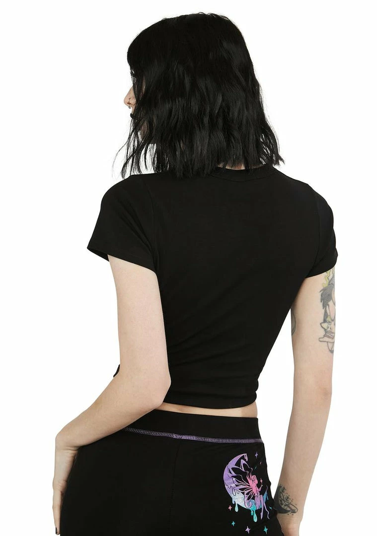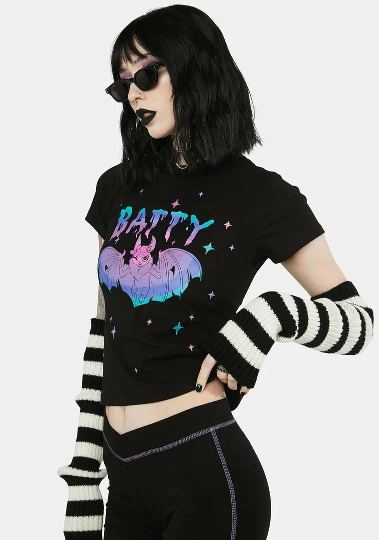 cuz you’re a creature of the night. This baby tee has a crew neckline, short sleeves, and a graphic of Shadow the bat on the front.