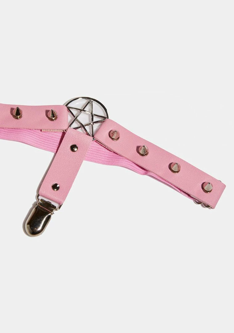 cuz you’re purrfect. This set includes thigh high tights with a cat face print and faux fur ear detailing and vegan leather garters with pentagram charms and metal clips.