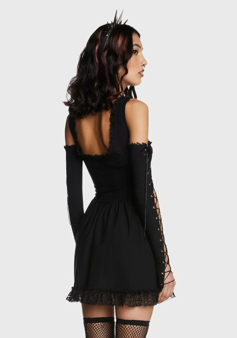 cuz with a little witchcraft. This mini dress has a stretch crepe construction, a square neckline, a lace trim, and comes with arm length lace up gloves.