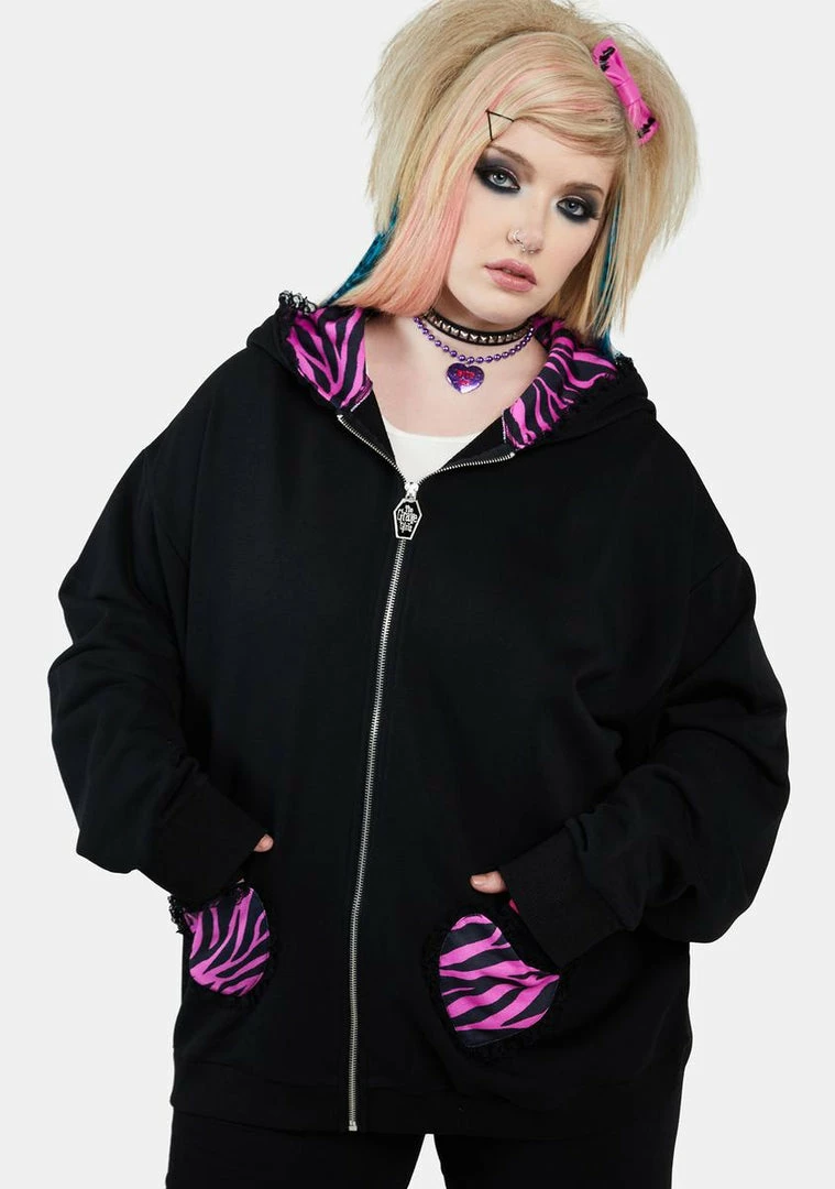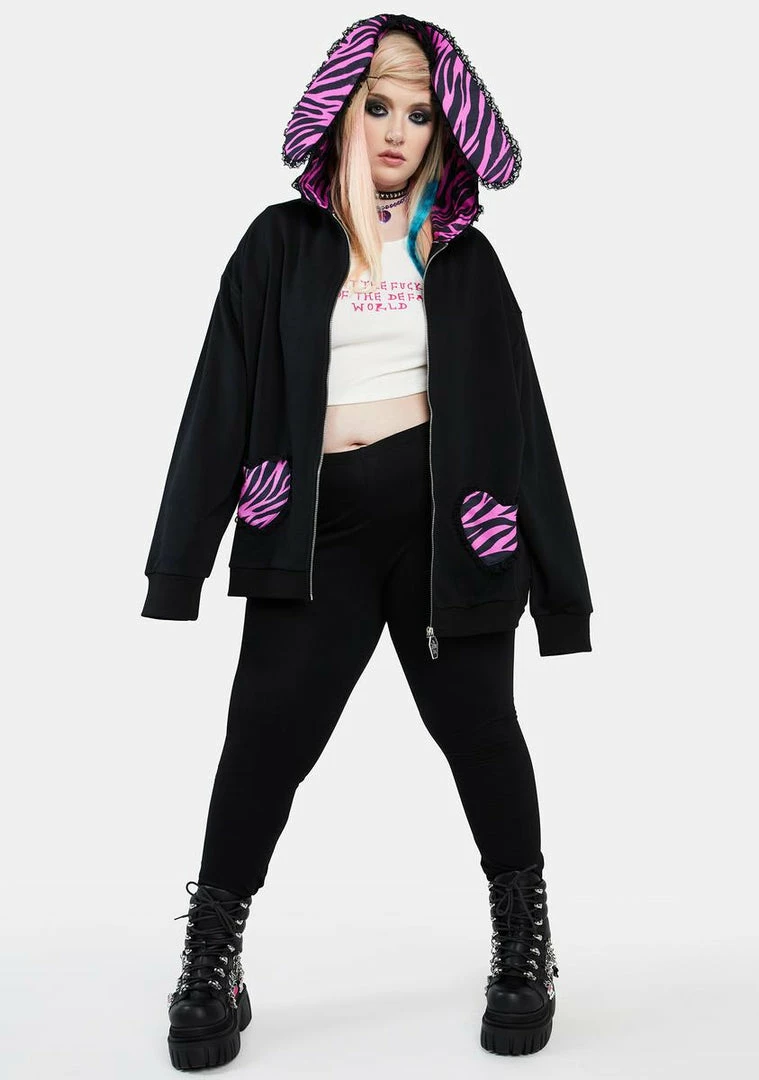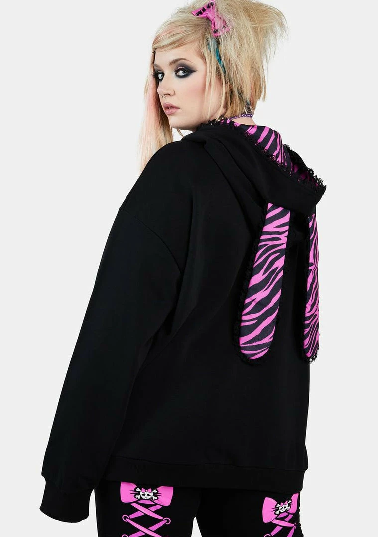 cuz it sold out in minutes! Take off the edge in this oversized hoodie that features heart-shaped front pockets with lace trim, zebra-printed accents, a fixed hood with faux bunny ears, and a front zip closure with a coffin-shaped pull.