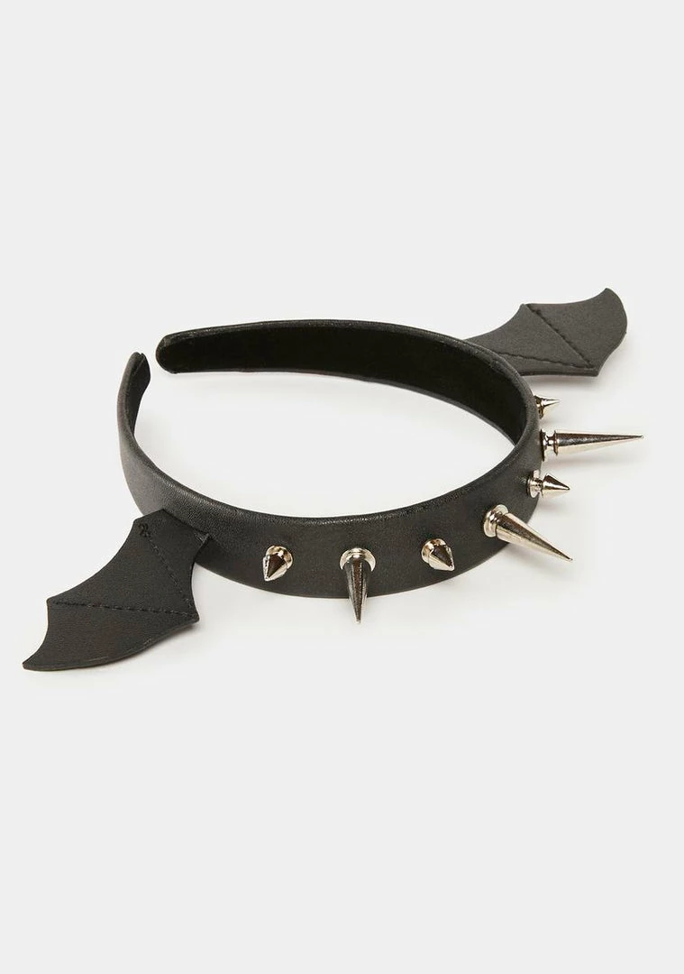 cuz you’re down with a little pain. This headband has a vegan leather construction and spiked studs and bat wings at top.