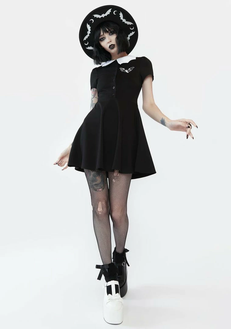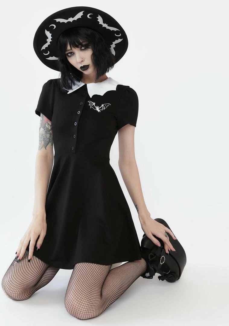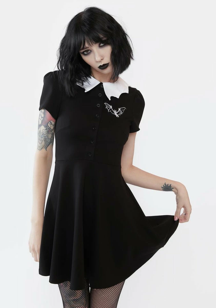 cuz you wanna escape the daylight. This mini shirt dress has a fit and flare silhouette, a contrast bat wing shaped collar, short sleeves, button up closures, and an embroidered bat graphic at the chest.