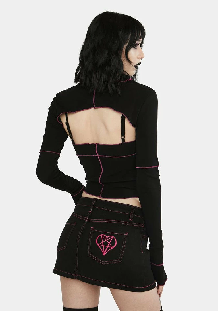 cuz you never know who might have that twinkle touch. You’ll be the ultimate in fairycore in this mini skirt that has a low rise fit, contrast stitching, pockets, heart and pentagram designs on the front and back, and a pentagram button and zip closure.