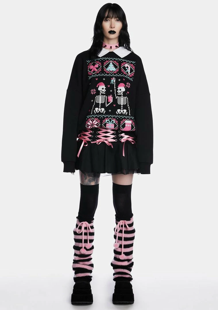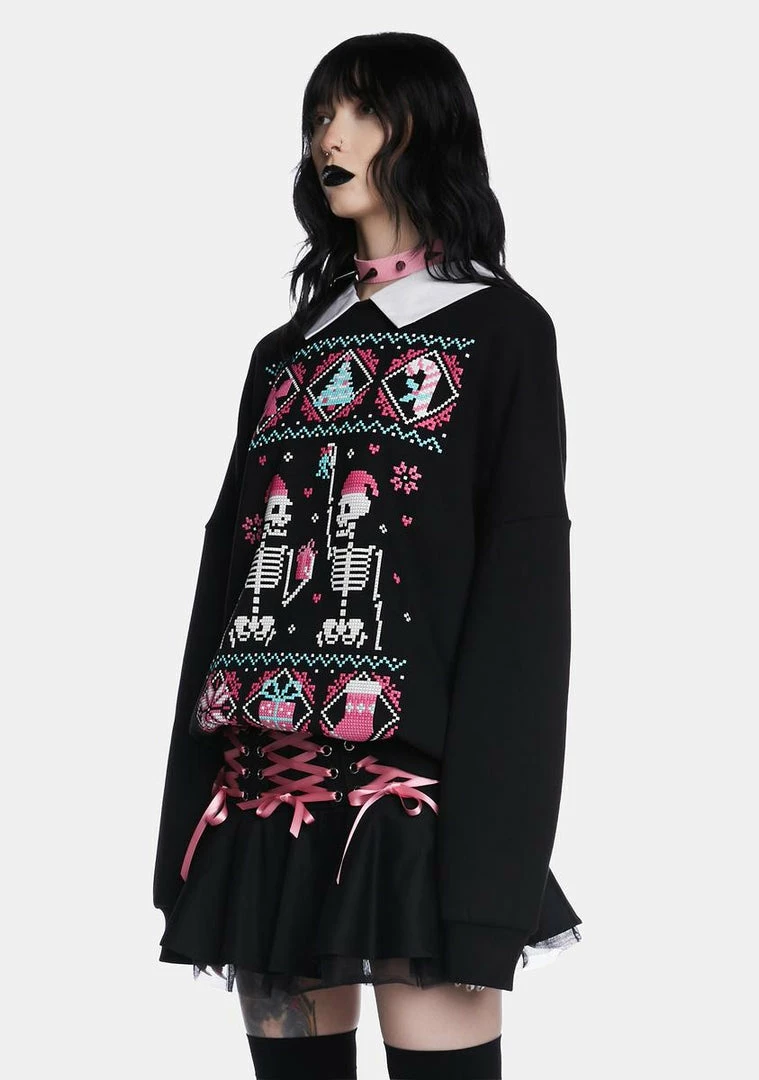 cuz mistletoe! This sweater has a stretchy construction, a fleece lining, a contrast colored neckline, long sleeves, an oversized fit, and a holiday graphic of skeletons, presents, candies, and bows on the front.