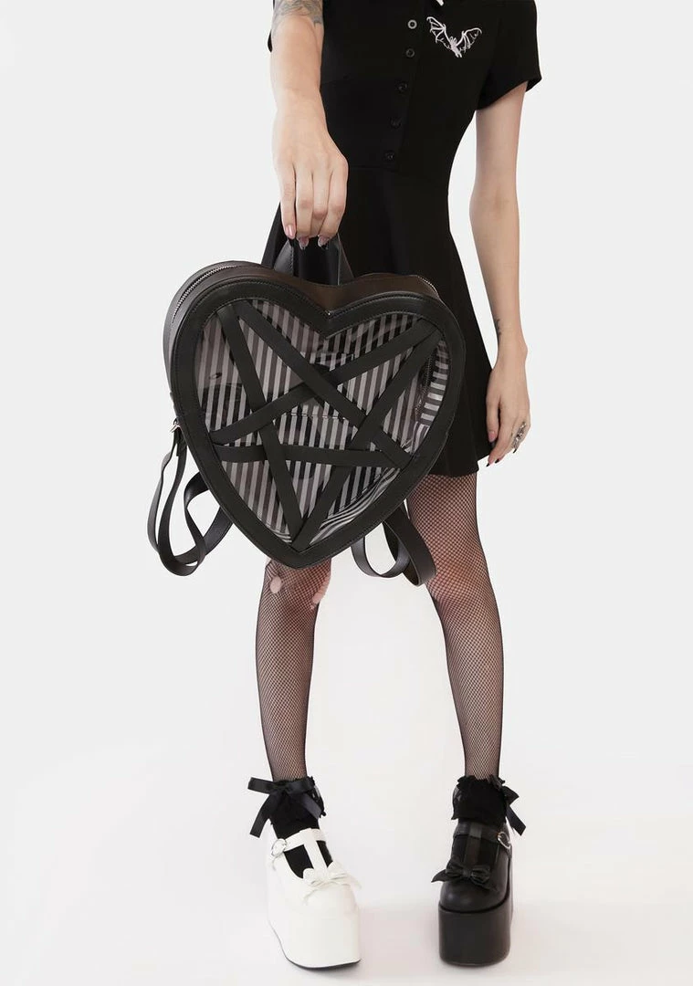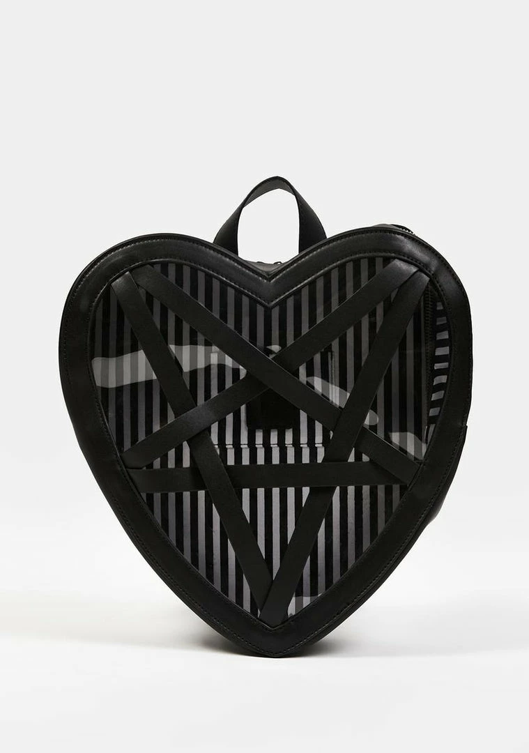 cuz youΓ’ΒΒre falling in love with the moonlight. This heart-shaped backpack has a vegan leather construction, a clear front panel with a pentagram design, a stripe patterned interior, and adjustable shoulder straps.