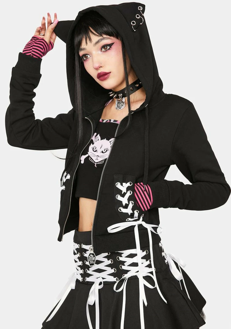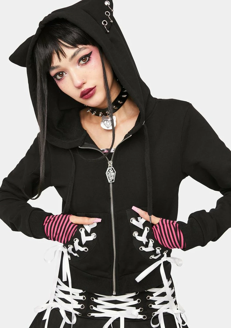 cuz you’re fur-bulous! Be the ultimate kitten with this hoodie that comes with pierced cat ears, adjustable drawstrings, long sleeves, front pockets with contrast colored lace up detailing, corset lace up detailing on the back with tie closures, and a front zip closure with a Grave Girls zipper charm.