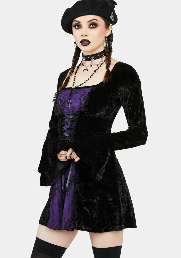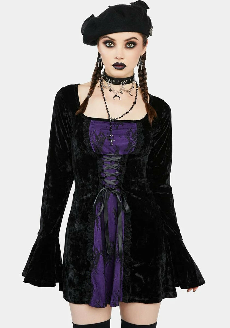 cuz you’re more of a night person. This mini dress has a stretchy crushed velvet construction, a contrast-colored lace-trimmed panel at front, adjustable lace-up ribbons at the waist, and flared flounce cuffs.