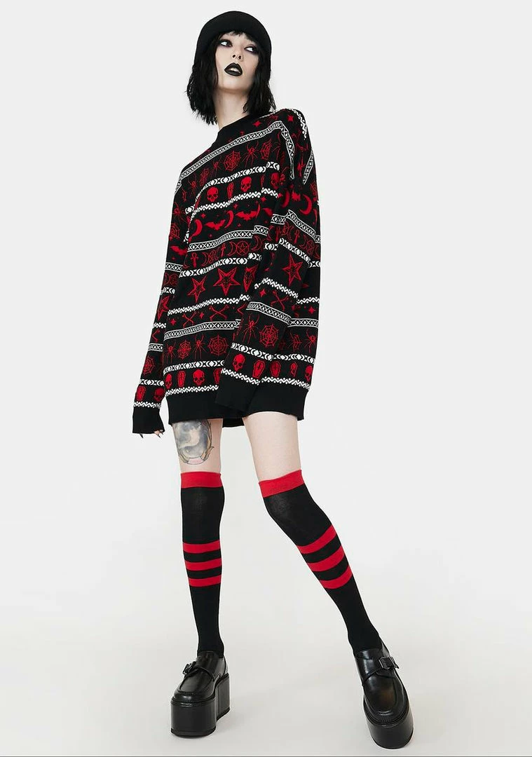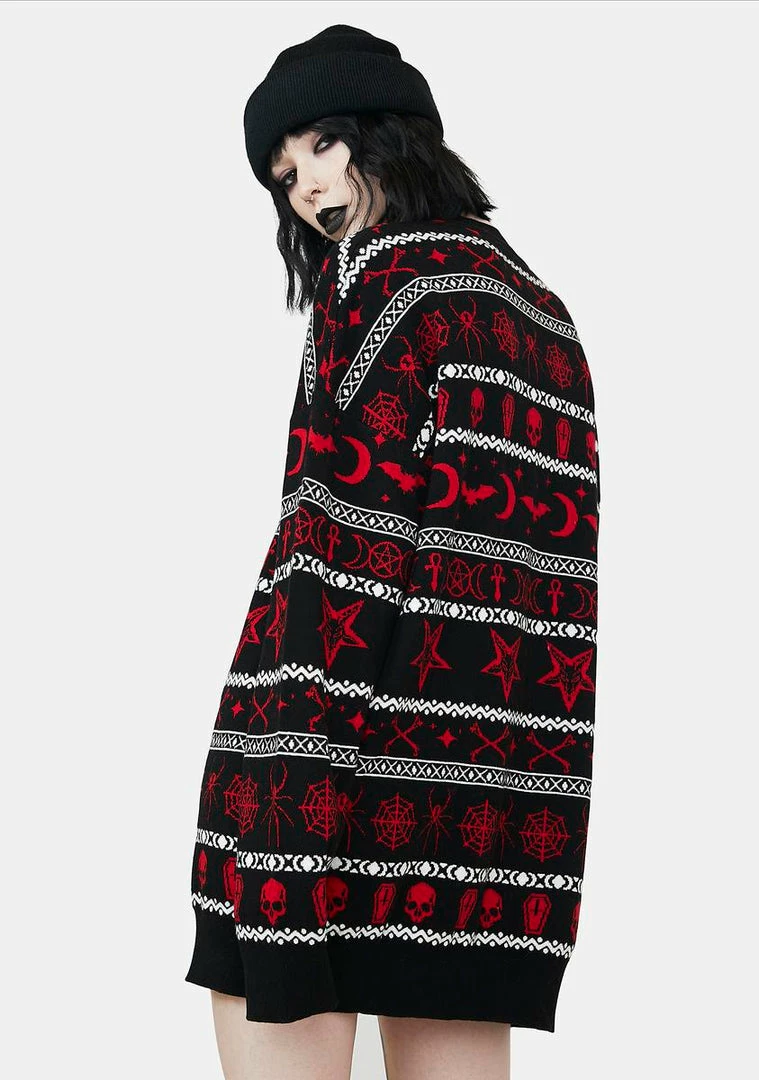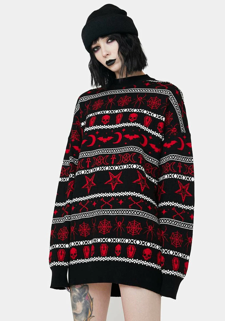 have a merry un-xmas! This holiday knit sweater has long sleeves, an oversized fit, and an intarsia print all over with gothic symbols.
