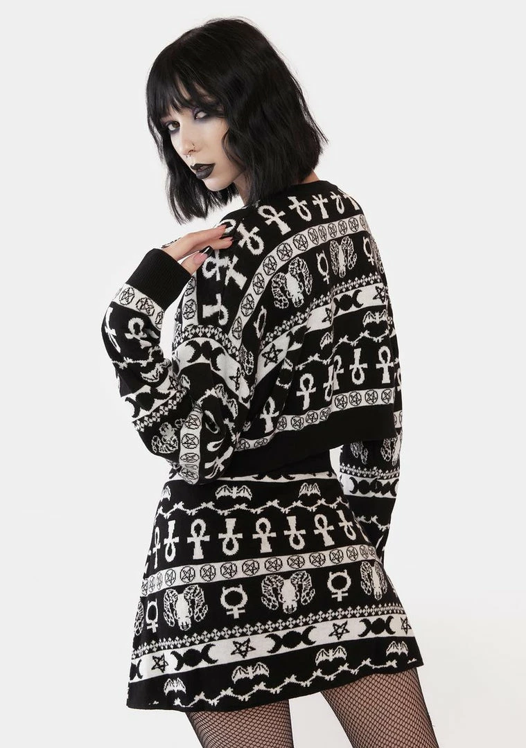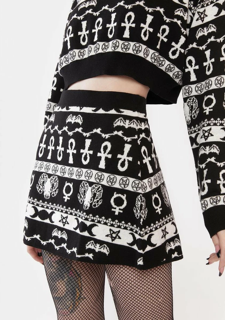 cuz you’re being bad and feeling good. This mini swing skirt has a knit construction, a high waist fit, and a fairisle pattern with gothic symbols all over.