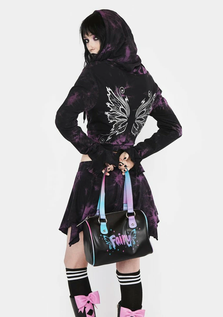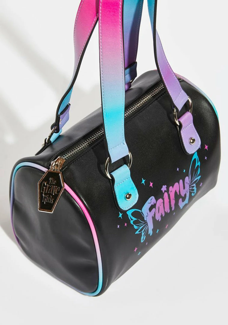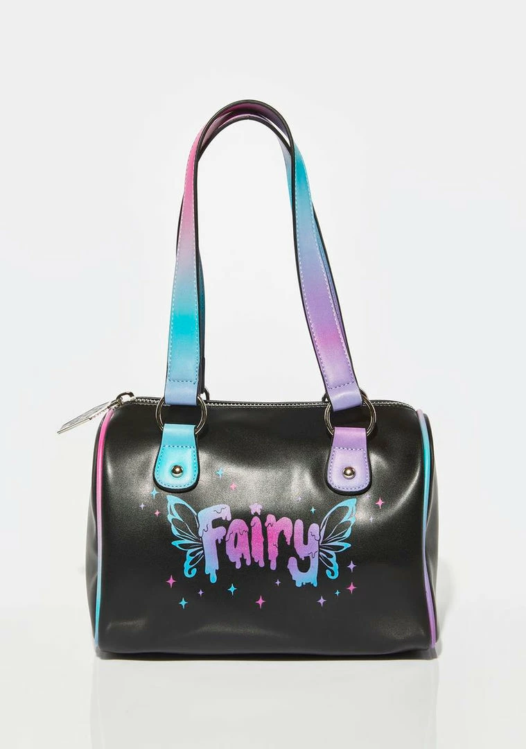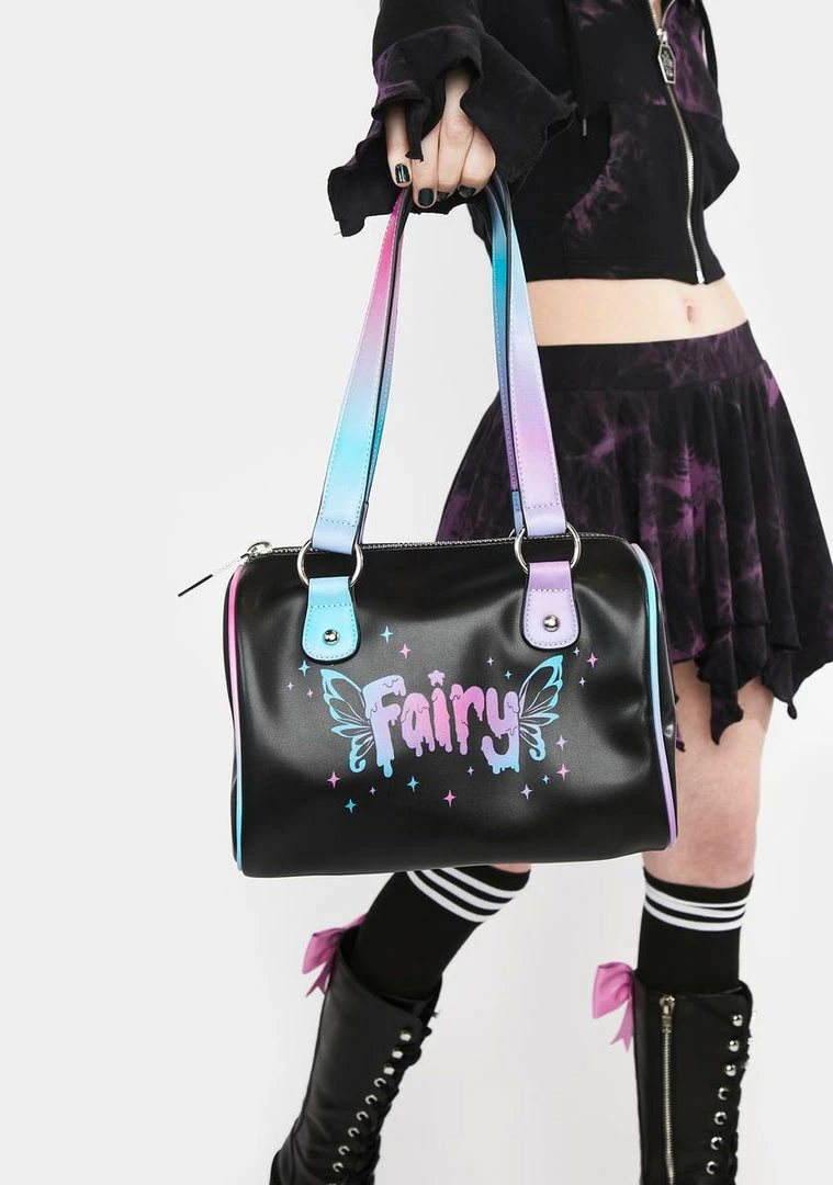 cuz it’s your true nature. Reveal the magic in this shoulder bag that has a vegan leather construction, ombre straps, a top zip closure, and “Fairy” printed on the front.