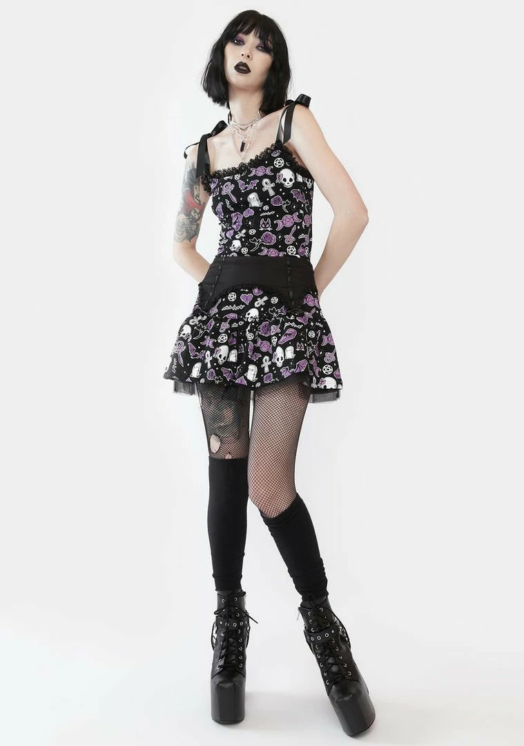 wanna dabble in the dark arts? This printed tank top has gothic graphics all over, lace ruffle trim, and adjustable ribbon tie shoulder straps.