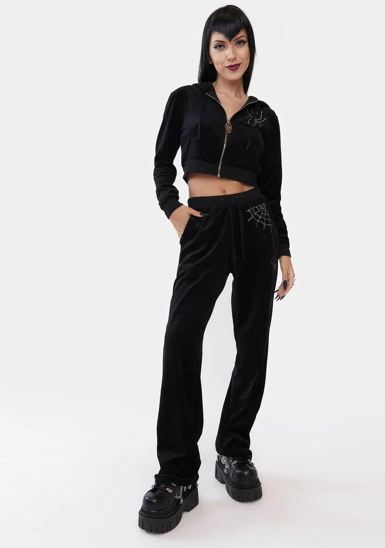 cuz you’re keepin’ it creepy. This hooded velour track jacket has a cropped fit, a front zip closure with a coffin logo charm, pockets on the sides, and rhinestone spider and web designs.