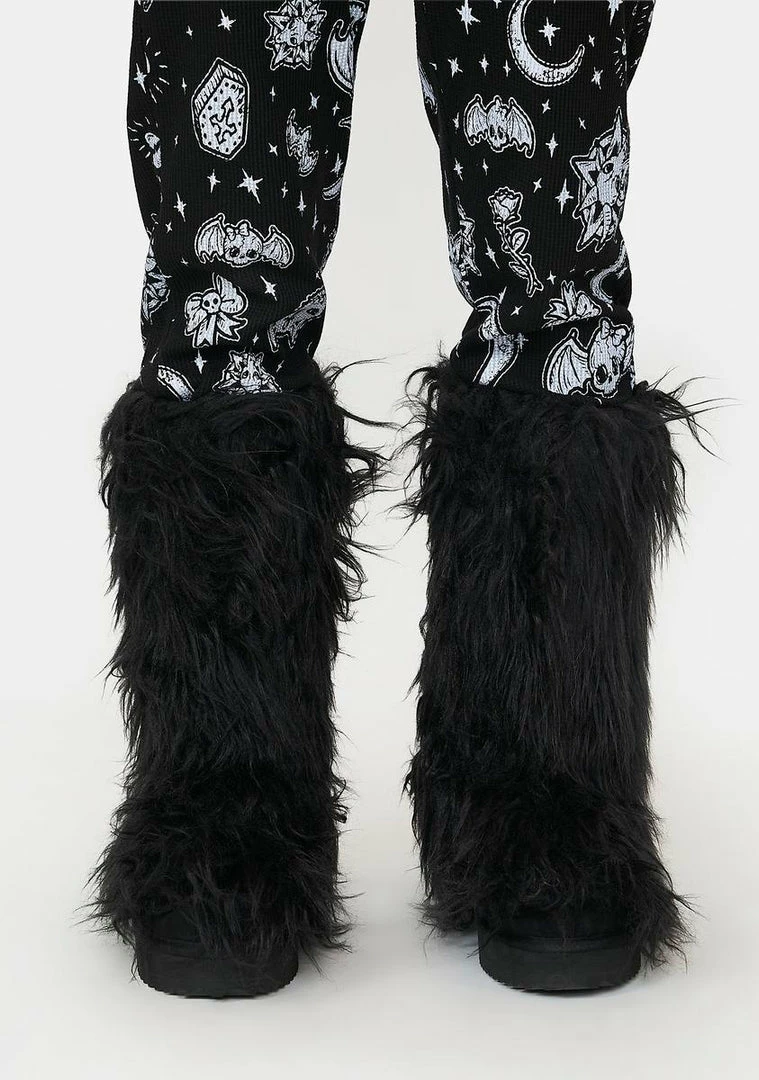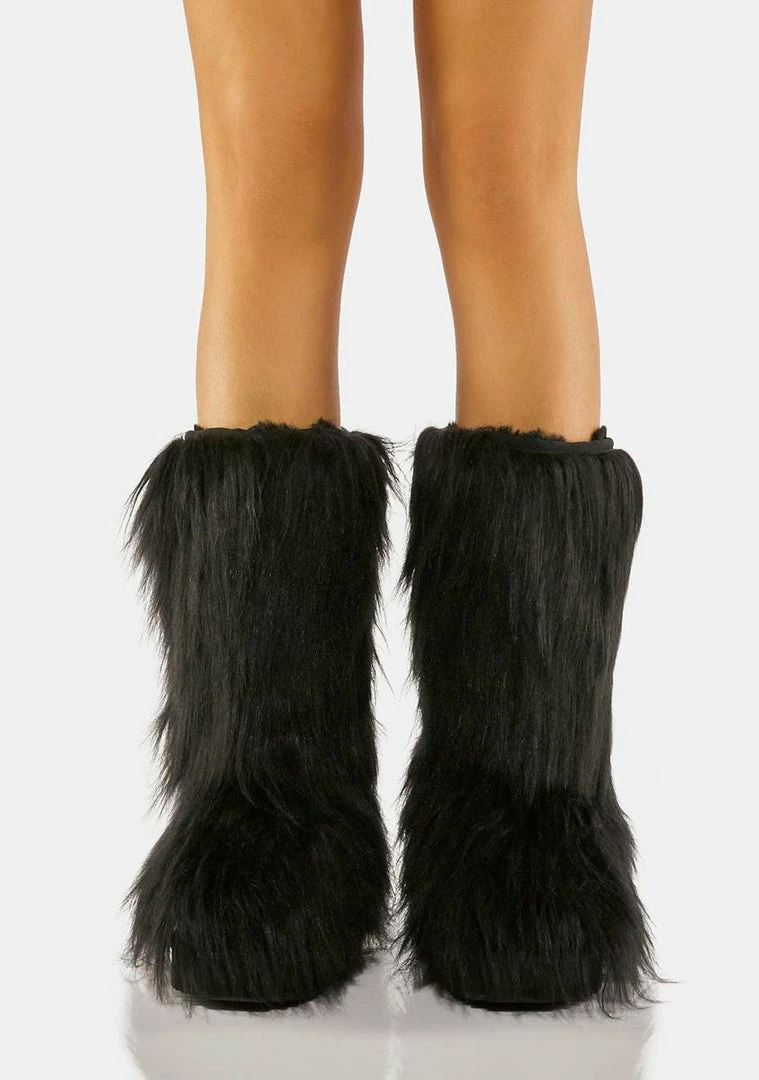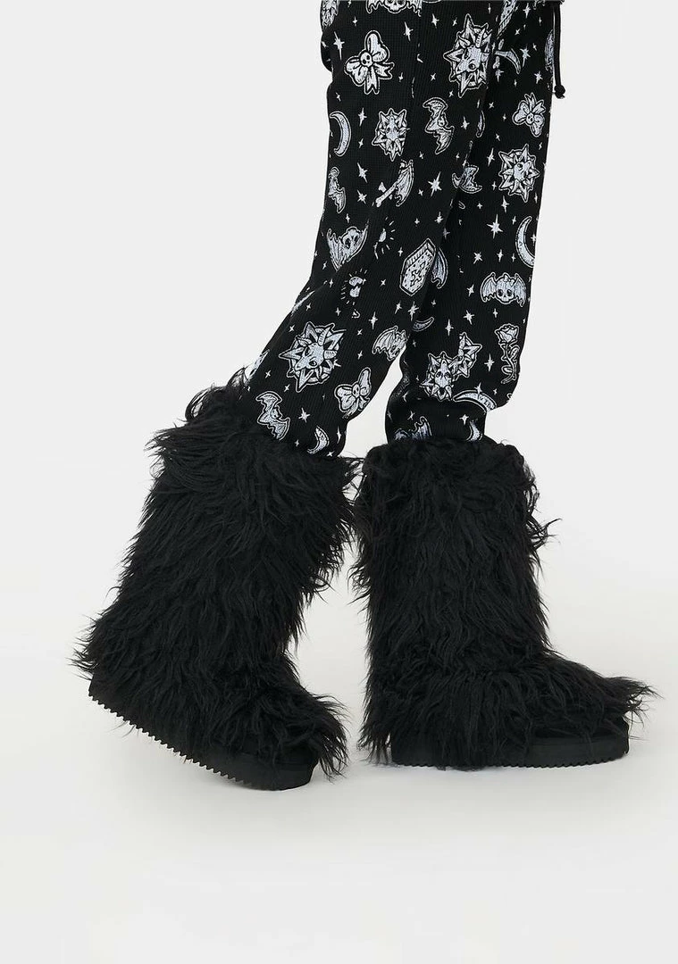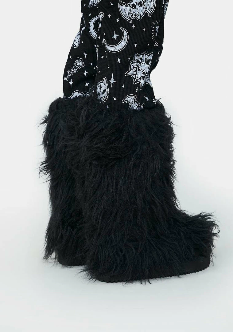 cuz you follow the moon. These slipper boots have a shaggy faux fur construction and platform soles.