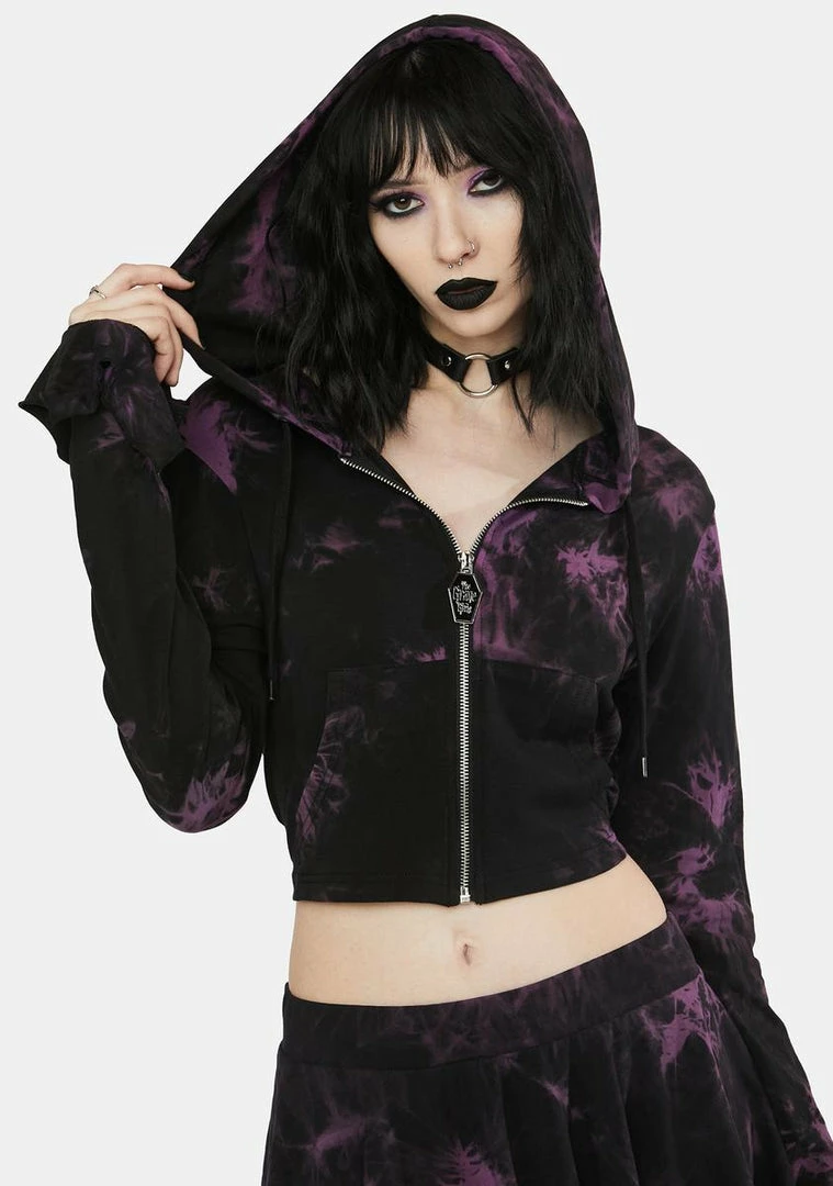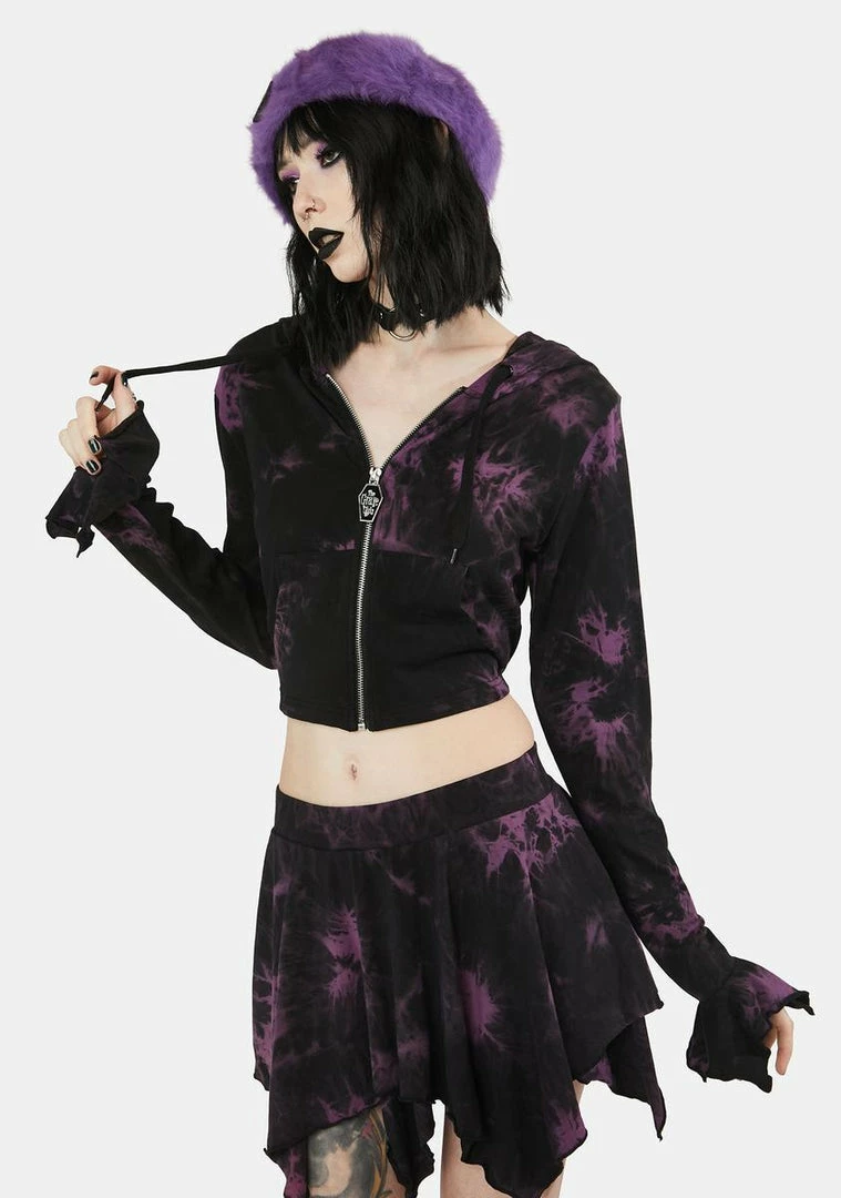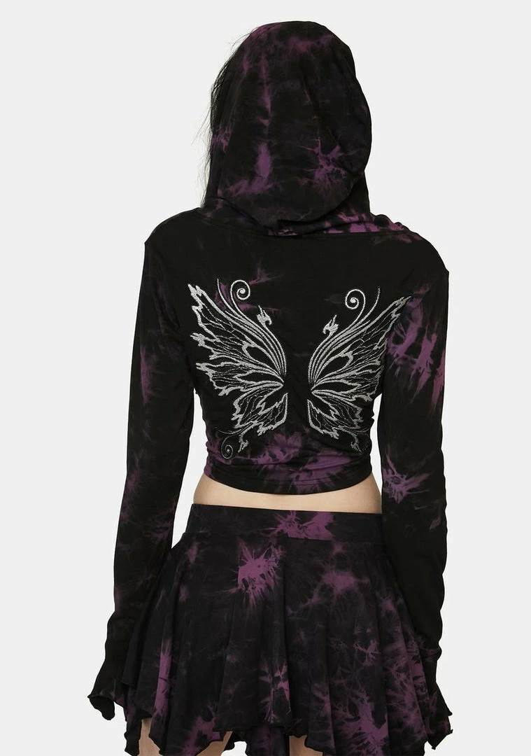 are you a good or naughty fairy? Keep them guessing in this hoodie which has a tie dye pattern all over, long sleeves, flared cuffs, embroidered fairy wings in the back, a zip up closure, and a cropped fit.