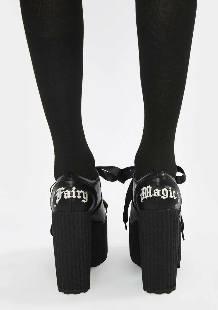 cuz your magic works best on a starry night. These platform creepers have a vegan leather construction, ribbon lace up closures, silver moon and star graphics, and “fairy magic” printed on the back.