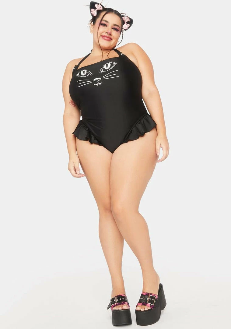 cuz meow. This one piece swimsuit has a halter neckline with adjustable tie closures, a frilly trim, and an embroidered cat design on the front.