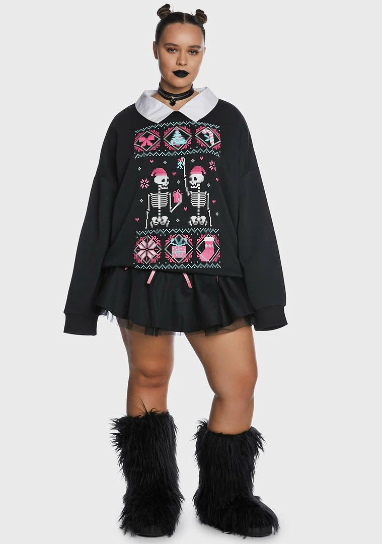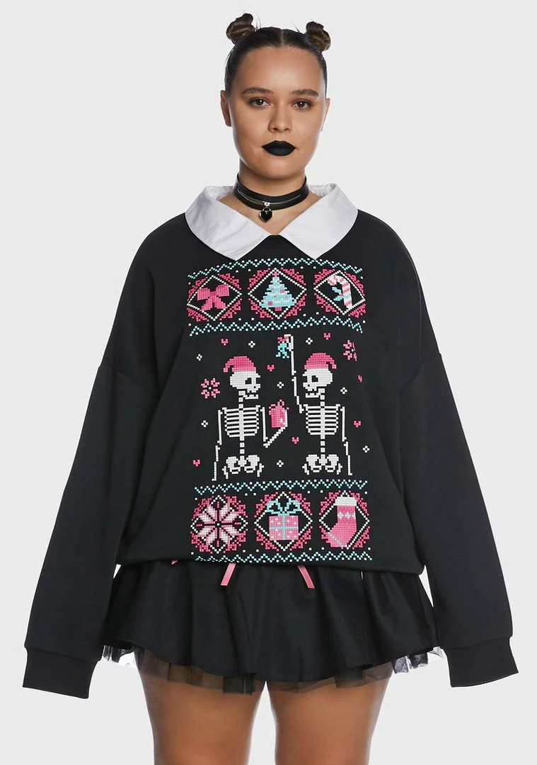 cuz mistletoe! This sweater has a stretchy construction, a fleece lining, a contrast colored neckline, long sleeves, an oversized fit, and a holiday graphic of skeletons, presents, candies, and bows on the front.