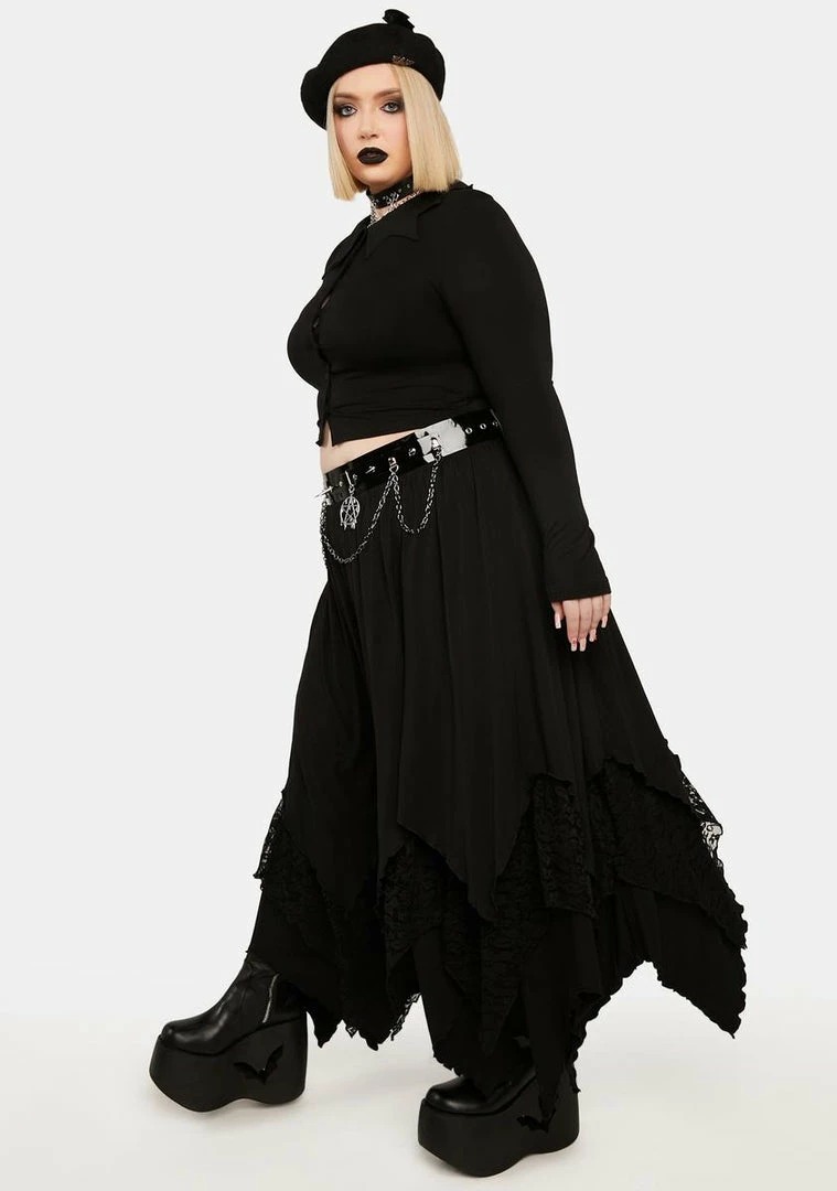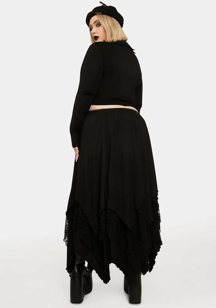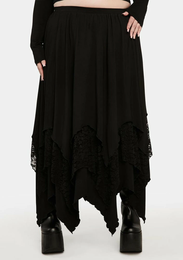 cuz the dark never bothered you anyway. This low-rise maxi skirt has opaque and sheer lace tiers, a handkerchief-style hem, and an elastic waistband for a comfortable fit.
