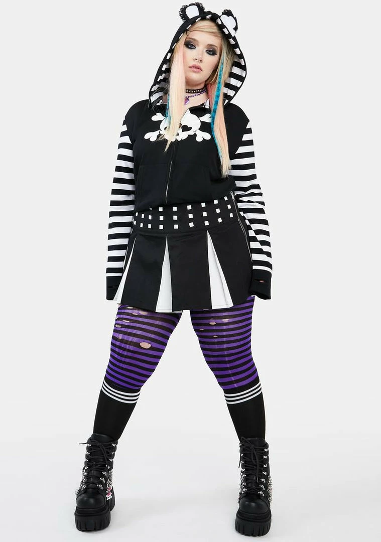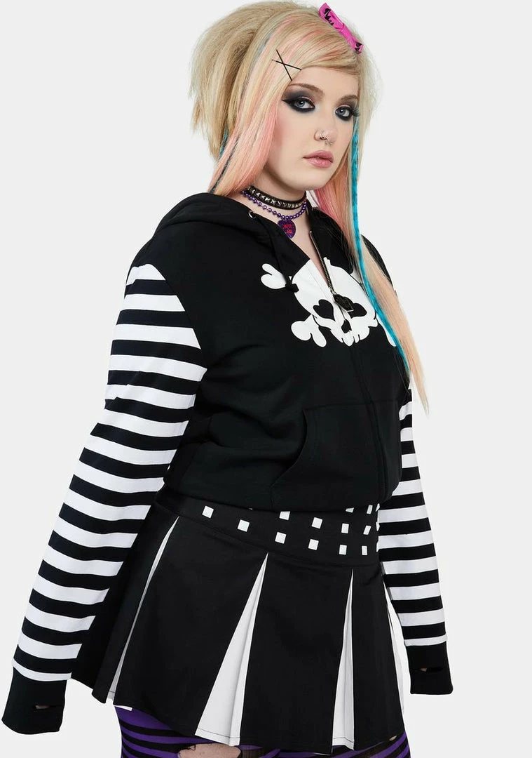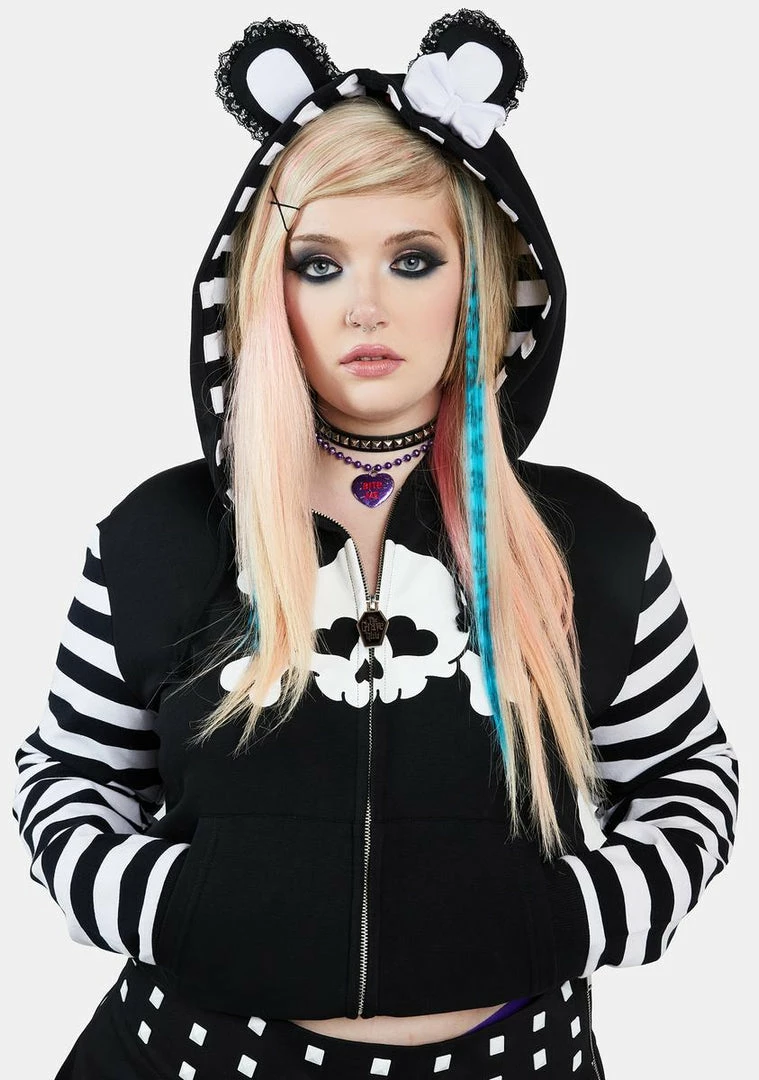 cuz drama is your middle name. This cropped sweatshirt features a skull and crossbones graphic at front, a drawstring hood with lace-accented ears and a bow applique, striped long sleeves with thumbhole cuffs, pockets on the front, and a zip-up closure.