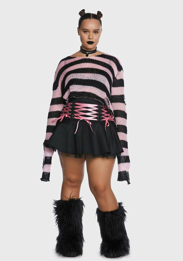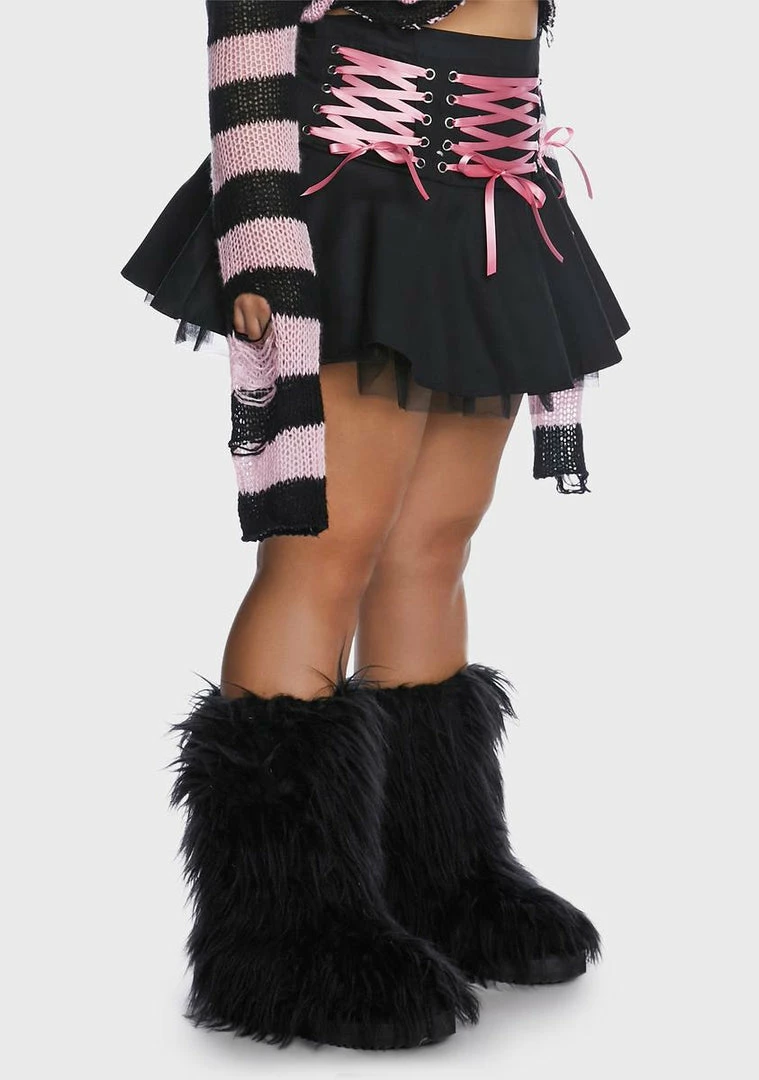 cuz you’re feeling immortal. This pleated mini skirt has sheer tulle underlayers, a high waist fit, a side zipper closure, and contrast pink ribbon lace-ups all over.