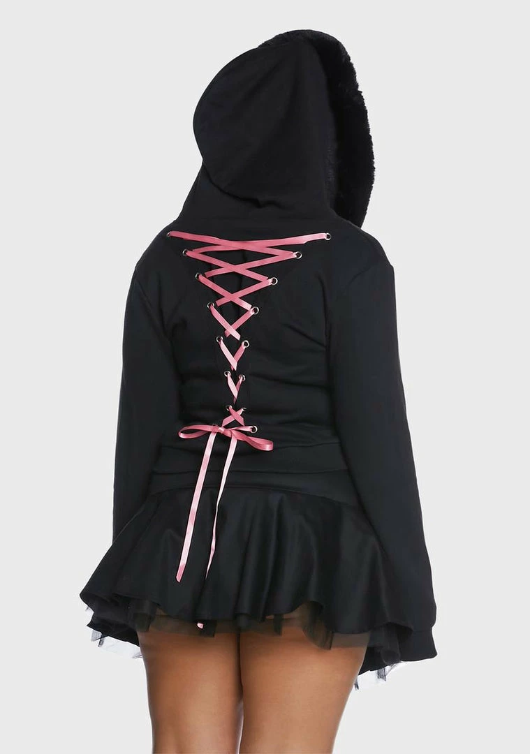 cuz you’re feeling immortal. This zip-up hoodie has plush faux fur trim, a slightly cropped fit, front pockets, and contrast pink ribbon lace-ups all over.