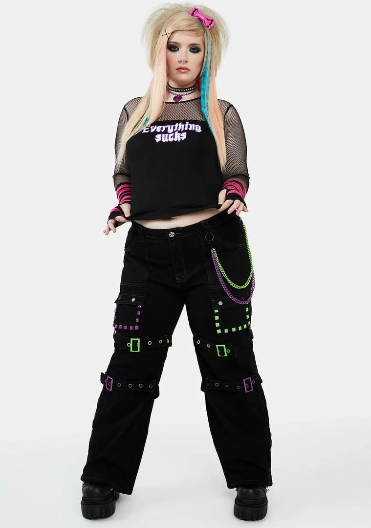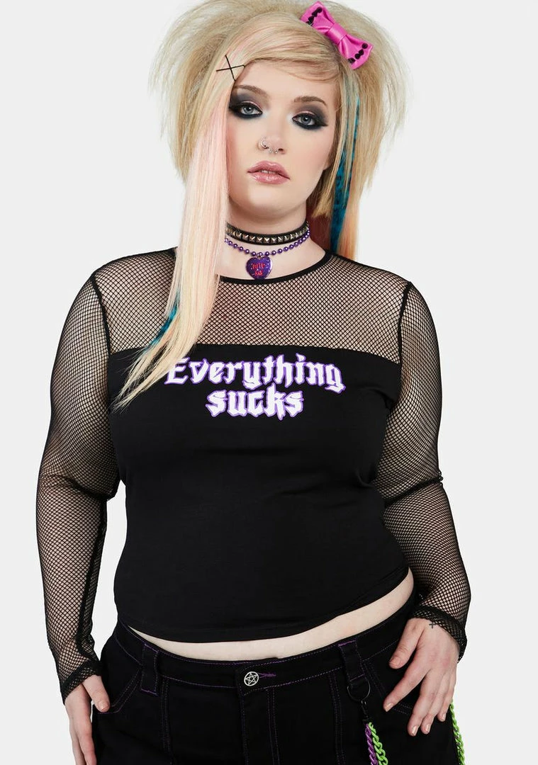 cuz reality is overrated. Vent to your friends in this long sleeve crop top that features an opaque tube top-style bodice, “Everything sucks” text printed at front, and a sheer fishnet fabrication at shoulders and arms.
