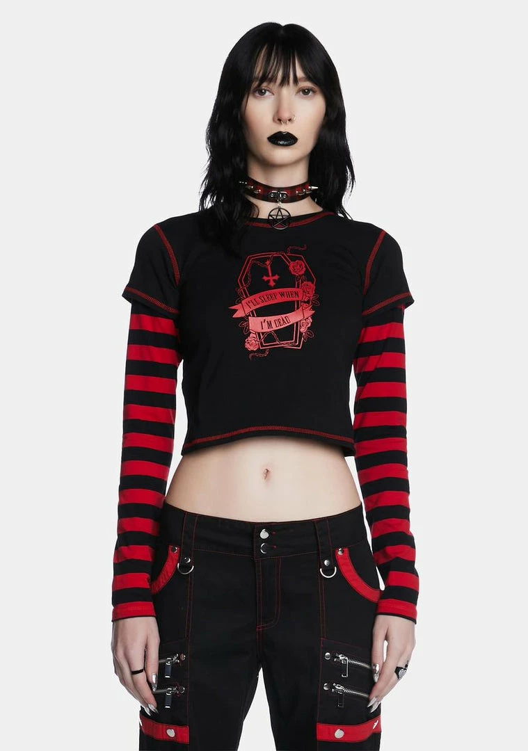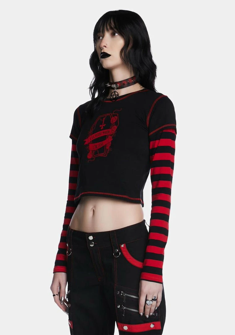 cuz there’s no rest for the wicked. This top comes in a cropped fit, with layered striped long sleeves, contrast stitching, and a coffin graphic print at front.