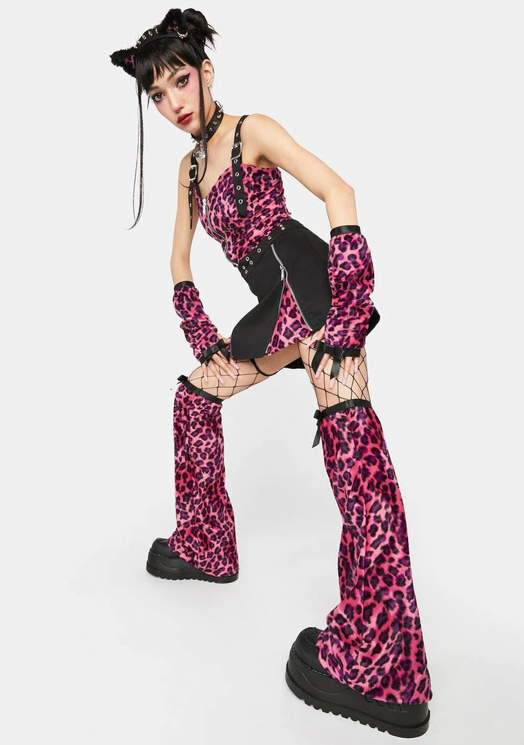 gotta be quick. Try your best in these leg warmers that come in a faux fur construction, with a pink leopard print all over, and satin bow details.