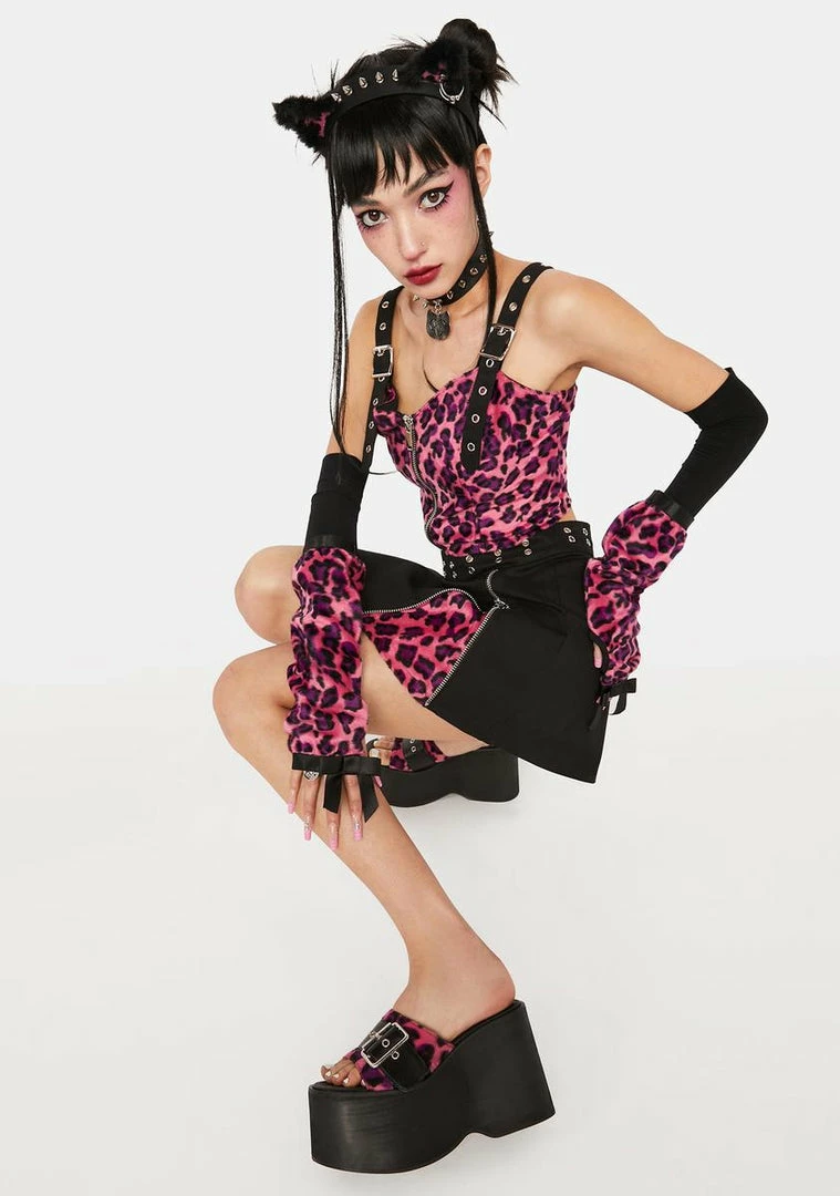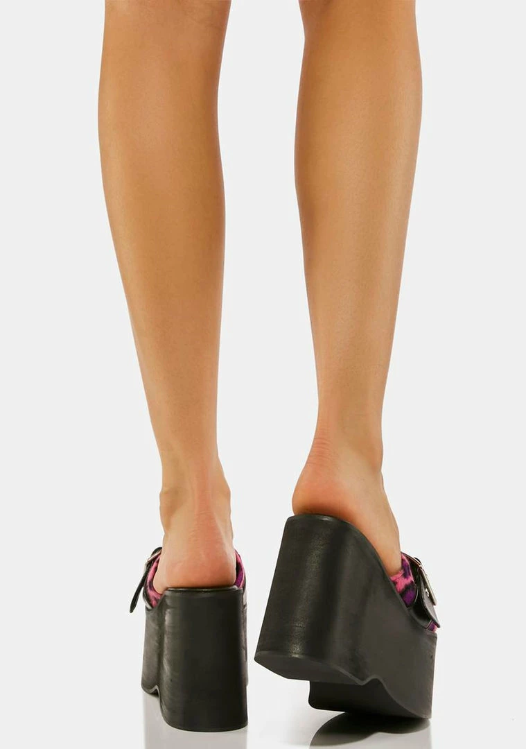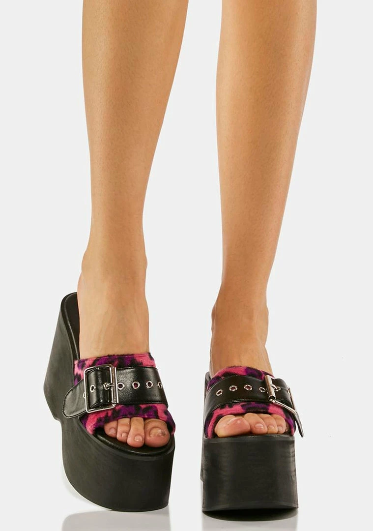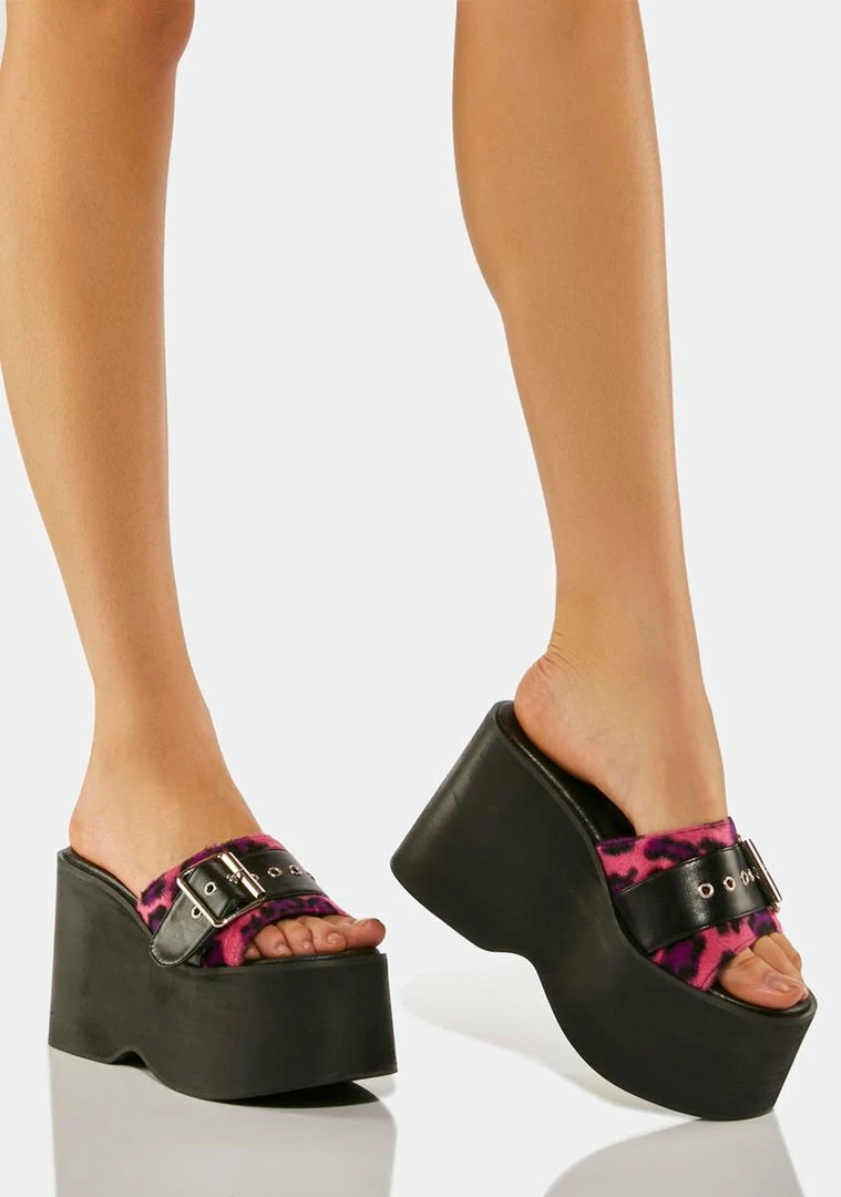 gotta be quick. Try your best in these platform slides that have a vegan leather construction, a faux fur pink leopard print all over, buckle detailing, and a slide on fit.