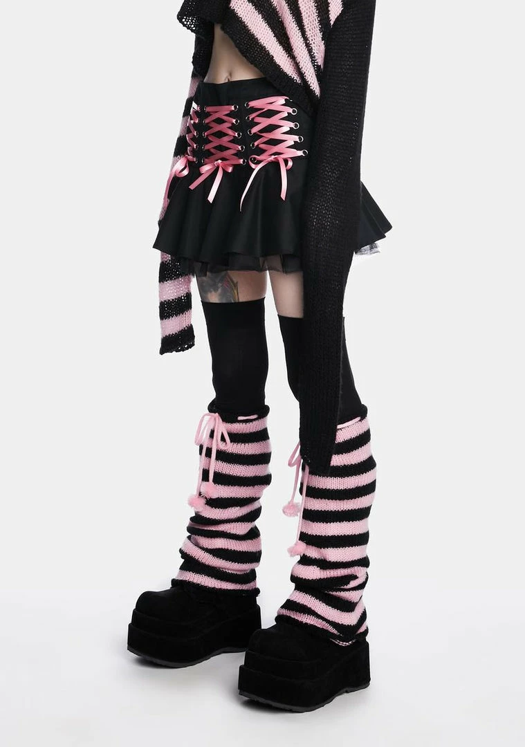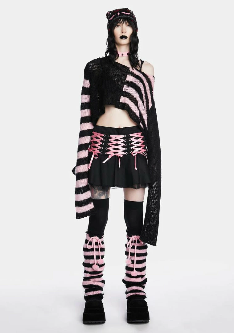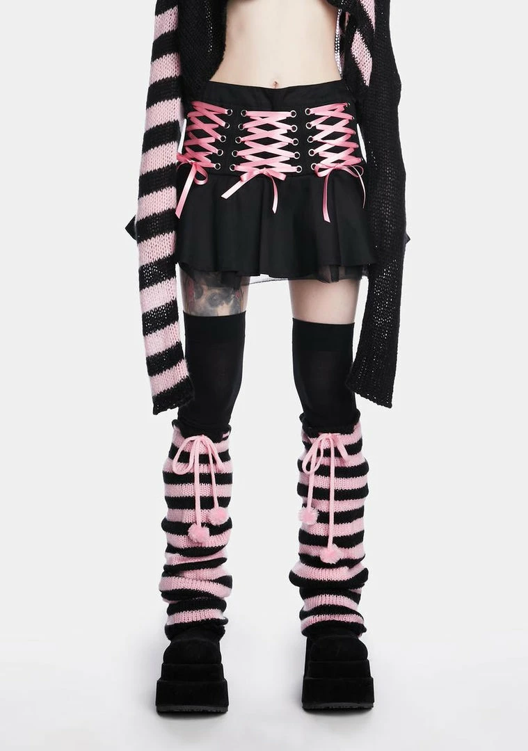 cuz you’re feeling immortal. This pleated mini skirt has sheer tulle underlayers, a high waist fit, a side zipper closure, and contrast pink ribbon lace-ups all over.