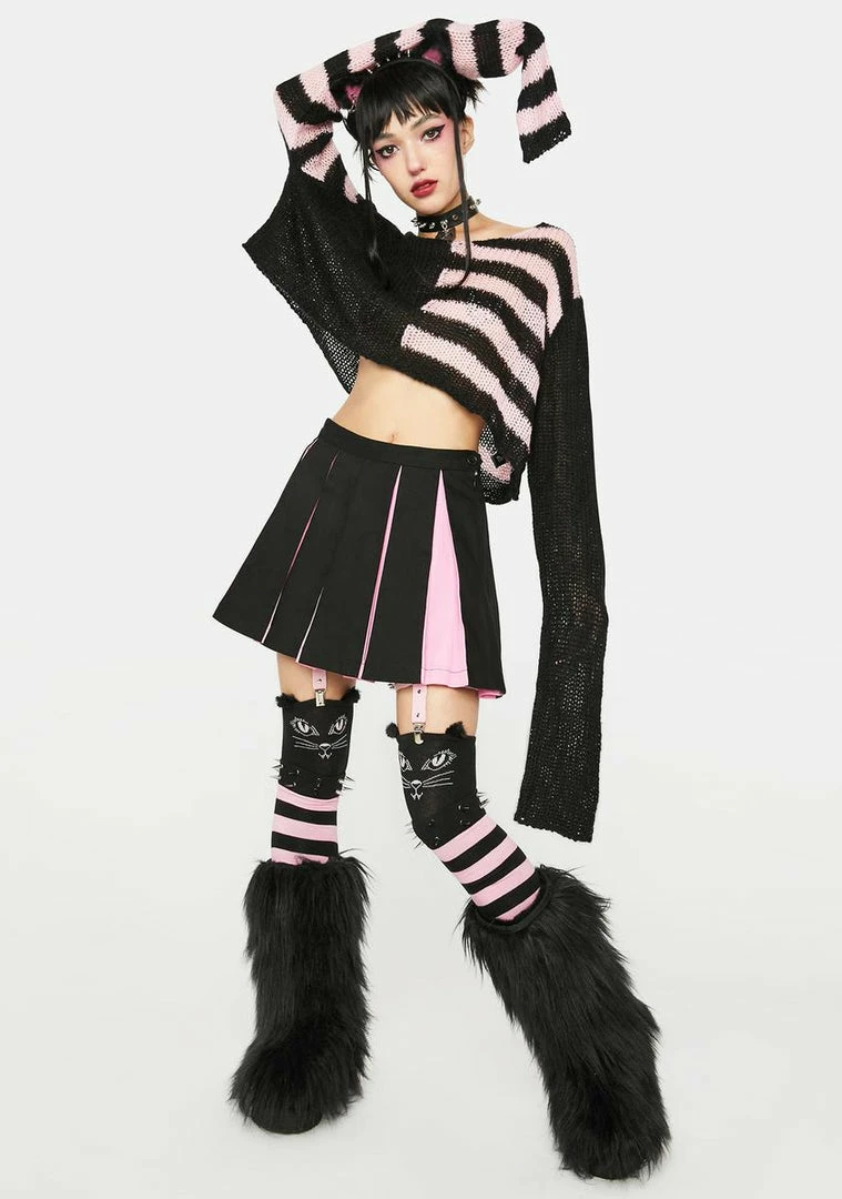 cuz there’s no going back now. Leave it all in the dust with this slouchy cropped sweater that has an open weave knit construction, a spliced solid black and pink striped design, and extra long sleeves.