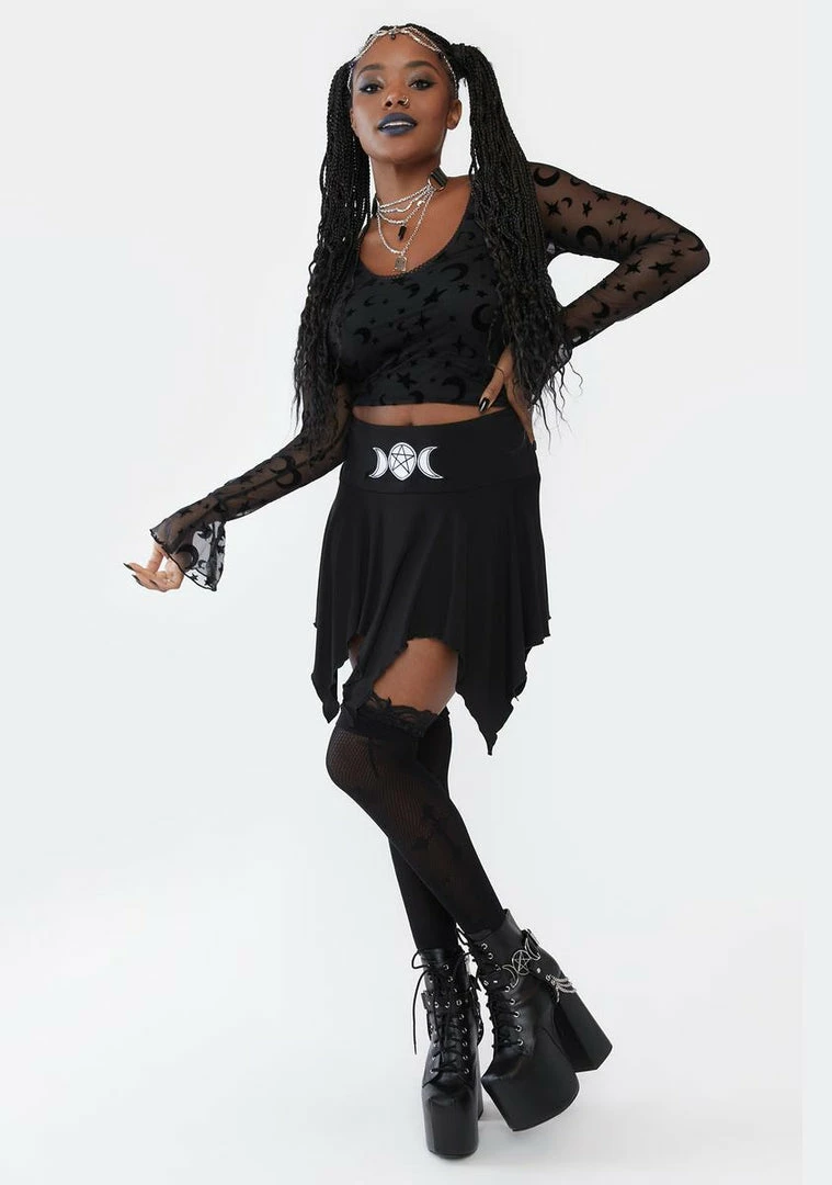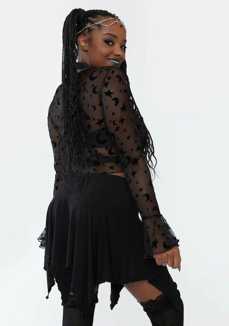 cuz you’re messing with magic! This mesh crop top has long sleeves with flared cuffs, a scoop neckline with tricot lace trim, and a stars and moon flocked pattern all over.