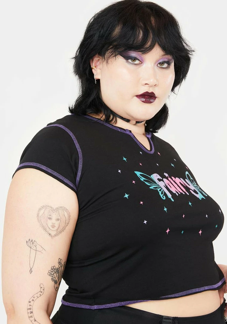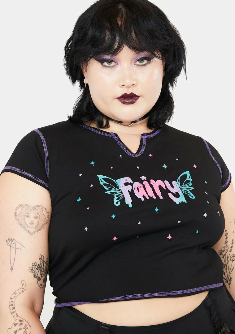 cuz it’s your true nature. This graphic crop top has cap sleeves, contrast stitching, and “Fairy” printed on the front.