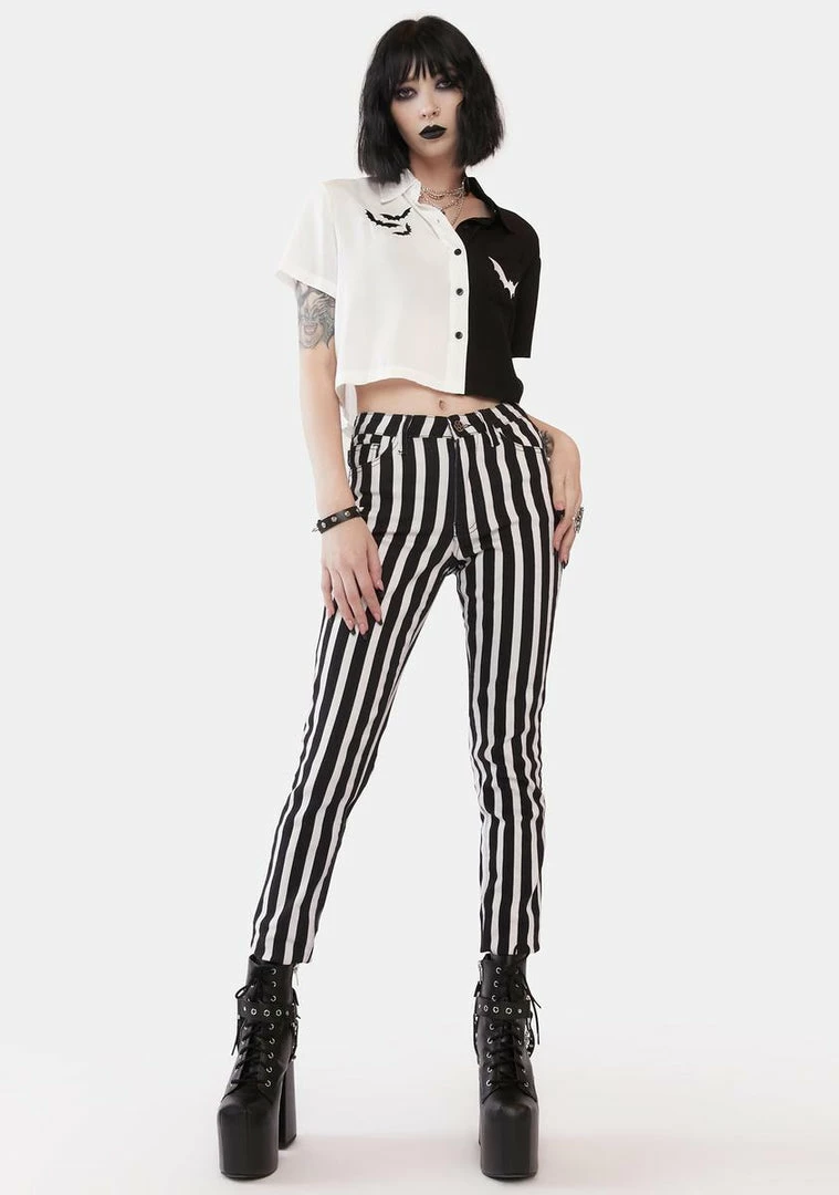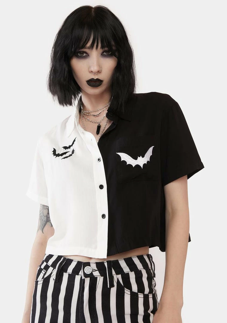 fly away where they can’t find you, babe. This button up shirt has a two-tone colorblock design, a slightly cropped fit, and embroidered bats on the front.