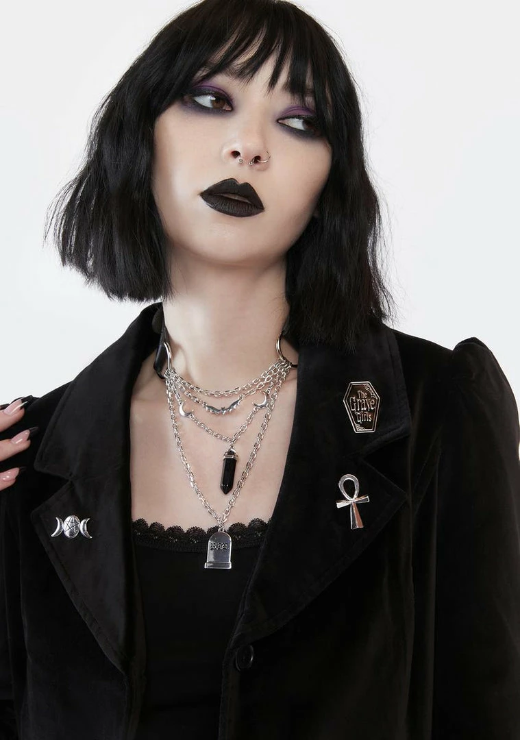 cuz the darkness holds your heart, babe. These enamel pins come in a set of three with ankh, pentagram moon, and logo coffin designs.
