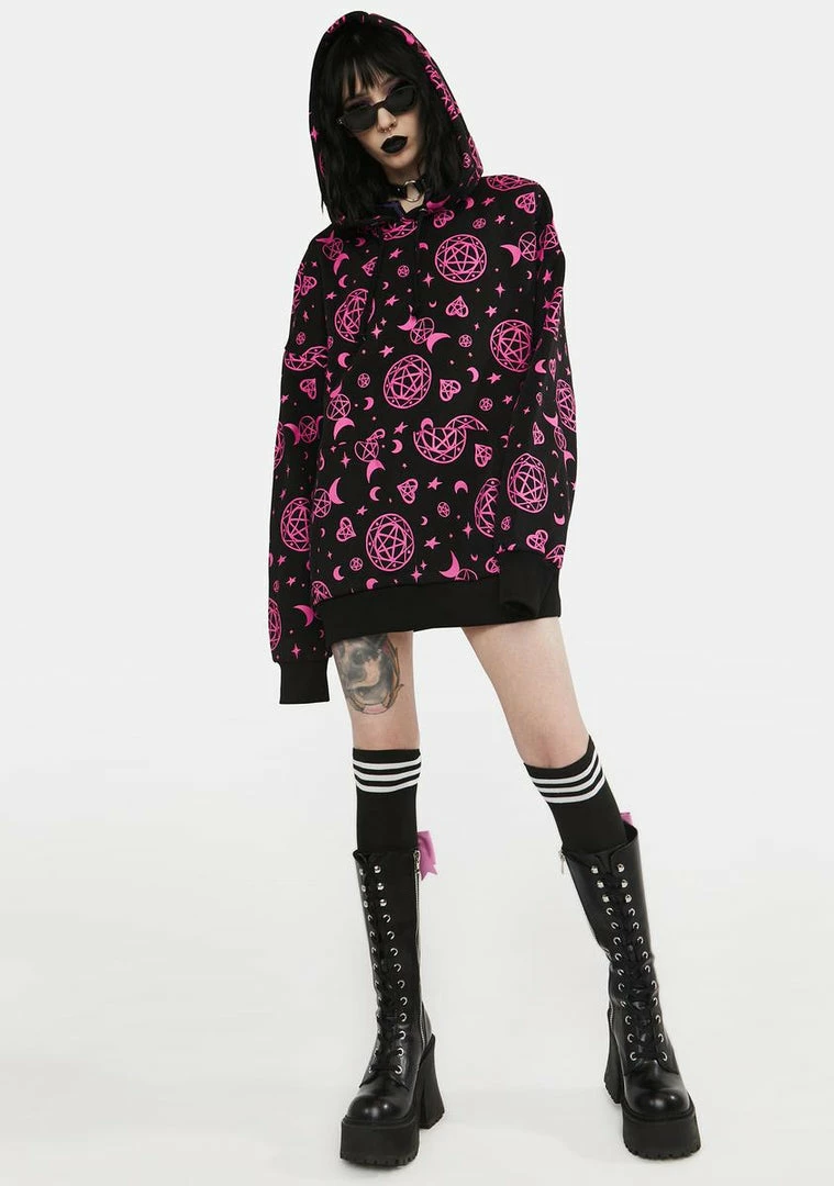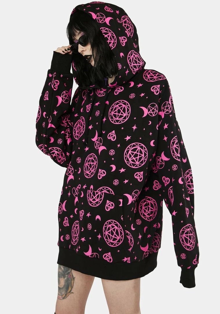 cuz you’re planning to rule the world. Conquer it in style with this oversized hoodie that has long sleeves, adjustable ties, a kangaroo pocket, and an all over print of pentagram star graphics, crescent moons, hearts, and stars.