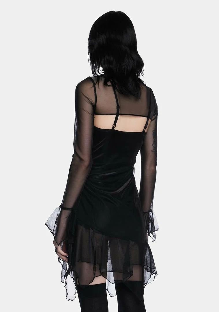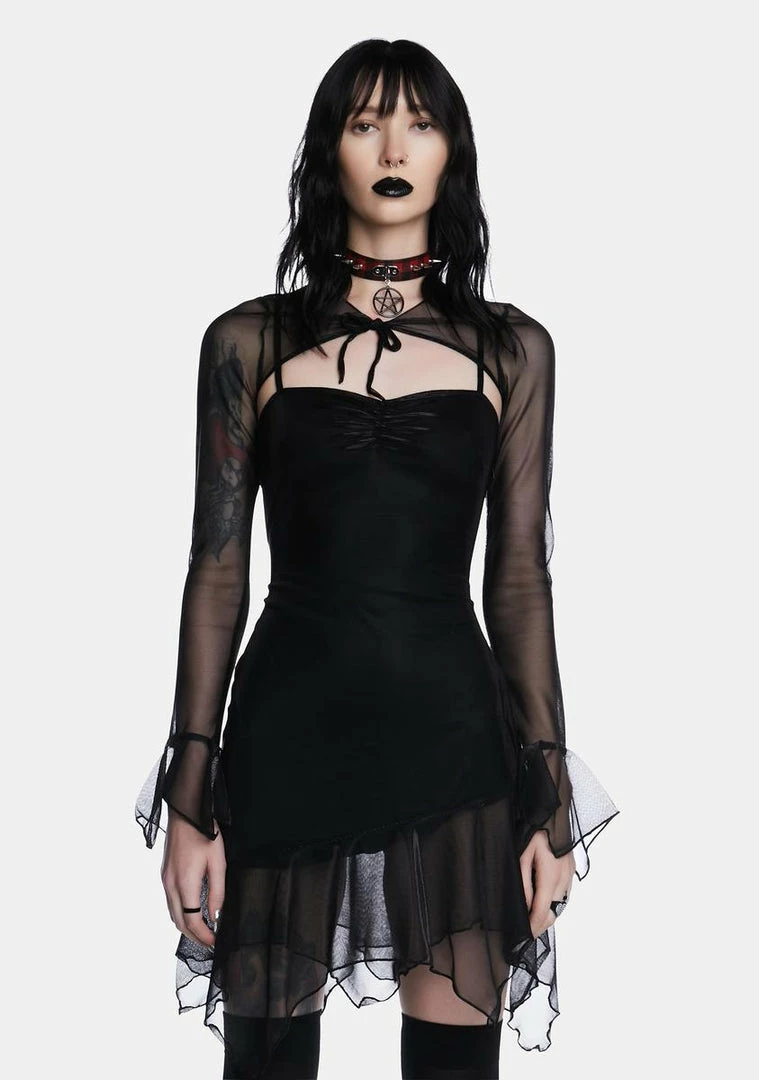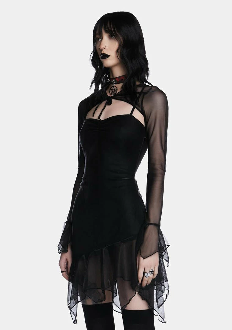 cuz on both the human and fairy worlds, you’re otherworldly. Cast your magic in this mini dress which has an iridescent construction, a sweetheart neckline, adjustable shoulder straps, an asymmetrical hem, a sheer mesh lining, and comes with a matching long sleeve shrug with flared cuffs.