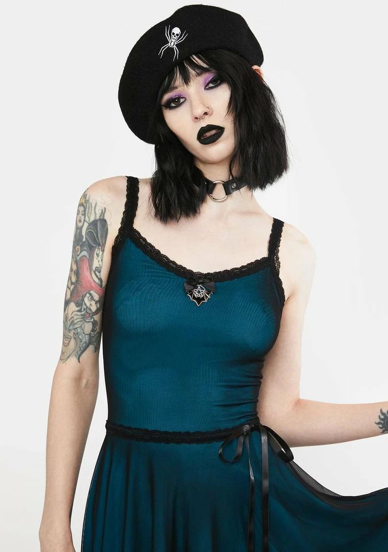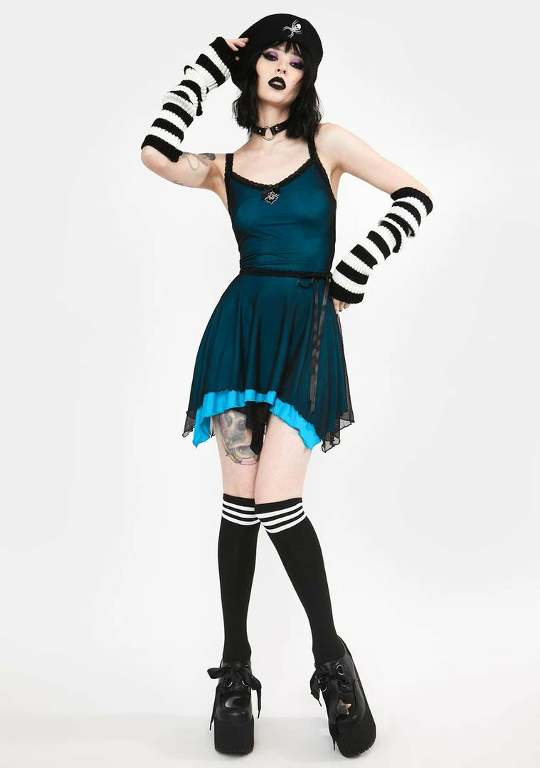 cuz the forest calls to you. Thrive in the magic with this mini dress which has adjustable shoulder straps, a lace trim, a charm brooch on the front, ribbon detailing around the waist, a mesh overlay, and an asymmetrical hem.